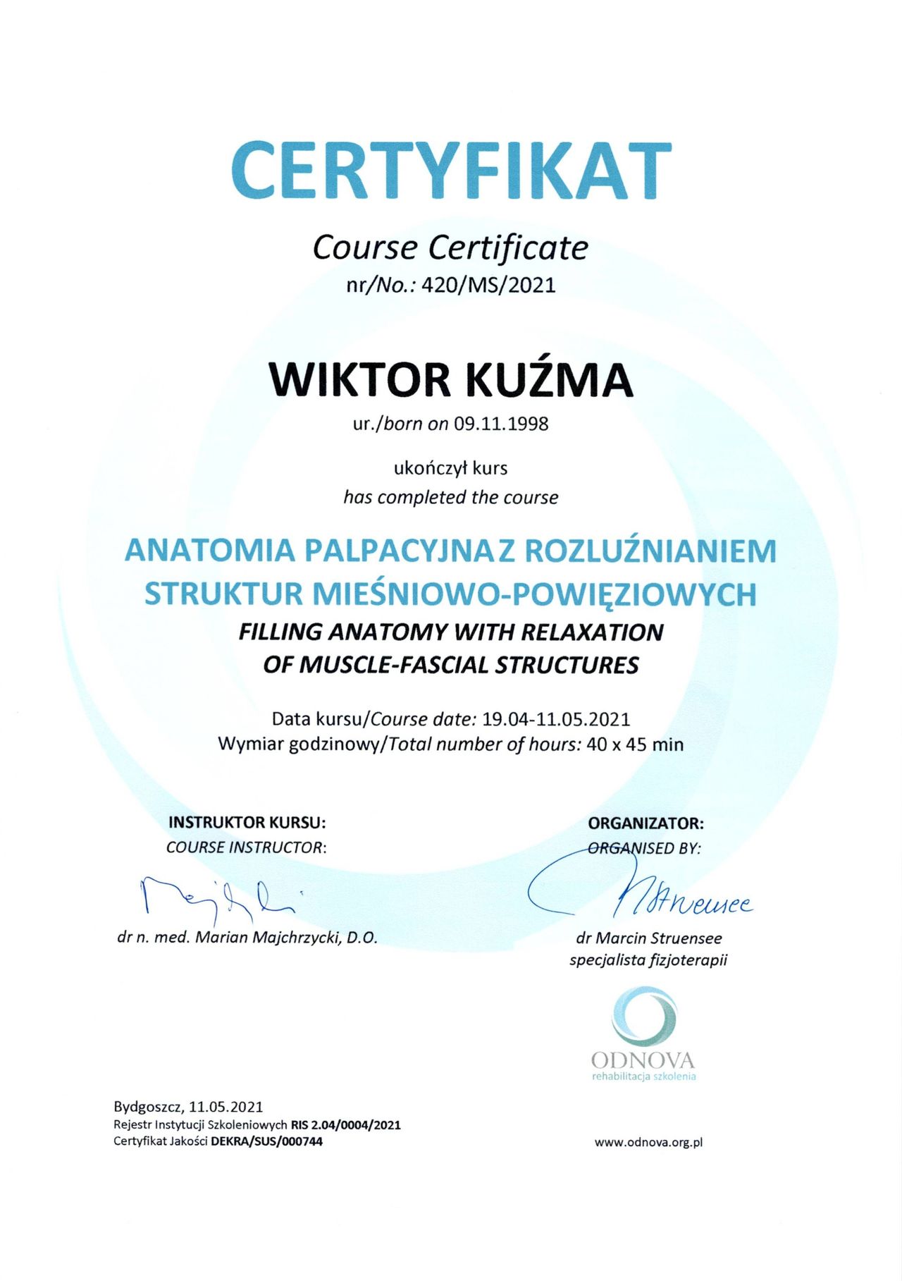 Jestem zobowiązany/a do ciągłego rozwoju zawodowego, uczestnicząc regularnie w szkoleniach i konferencjach branżowych. Moje zadowolenie płynie z widzenia poprawy zdrowia i jakości życia moich pacjentów dzięki efektywnej fizjoterapii.