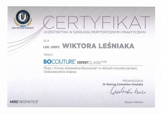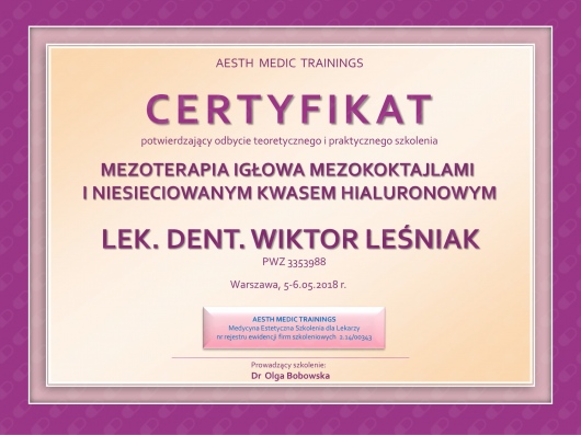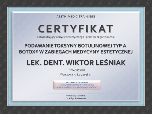 Jestem absolwentem Collegium Medicum Uniwersytetu Jagiellońskiego w Krakowie ( 2011 - 2016 ), Warszawskiego Uniwersytetu Medycznego na kierunku Medycyna Estetyczna ( 2017 - 2018 ) oraz członkiem Amerykańskiej Akademii Medycyny Estetycznej (AAAM).