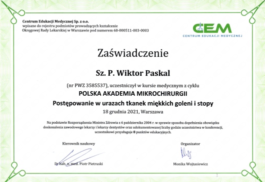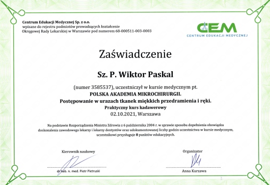 Pan Doktor Wiktor Pascal to wyjątkowy specjalista – niezwykle zaangażowany, kompetentny, słowny, ale również miły i serdeczny. Od pierwszej wizyty dało się odczuć, że pacjent i jego dobro są dla niego najważniejsze. Cierpliwie odpowiadał na każde, nawet najdrobniejsze pytanie – zarówno podczas wizyty ambulatoryjnej, jak i podczas pobytu w szpitalu. Przed operacją dokładnie wyjaśnił wszystkie etapy leczenia, co pozwoliło mi podejść do zabiegu syna z większym spokojem. Po operacji również otoczył nas troskliwą opieką i zawsze znajdował czas, by rozwiać wszelkie wątpliwości. To lekarz z prawdziwym powołaniem, ogromną wiedzą, doświadczeniem i niesamowitą empatią.