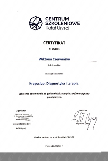 Na pierwszej wizycie został przeprowadzony dokładny wywiad a na kolejnej szczegółowo i jasno zostały pokazane wszystkie ćwiczenia. Bardzo polecam Panią Wiktorię :)