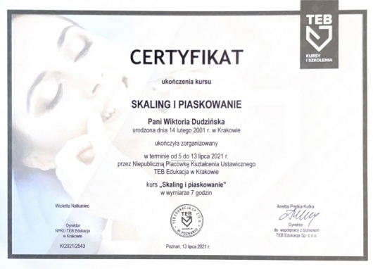 Pani Wiktoria była bardzo dokładna. Pierwszy raz w życiu miałam tak dobrze zrobioną higienizacje. Polecam
