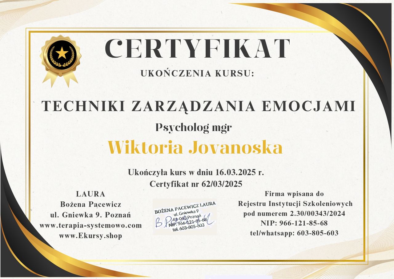 Jestem psychologiem i nauczycielem akademickim. Ukończyłam specjalność kliniczną na Uniwersytecie im. Adama Mickiewicza, a w swojej pracy łączę solidną wiedzę z autentycznym, indywidualnym podejściem. Wierzę, że każdy człowiek to inna historia, dlatego nie stosuję gotowych schematów – zamiast tego uważnie słucham i dostosowuję metody pracy do Twoich potrzeb.
