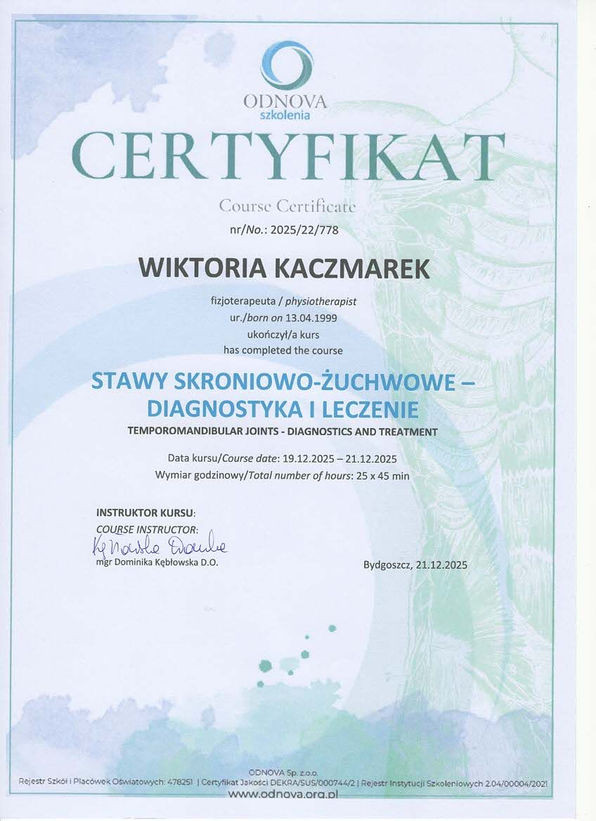 Miałam okazję korzystać z terapii blizny po laparotomii u Pani Wiktorii i z całego serca mogę polecić korzystanie z jej pomocy! Już od pierwszego spotkania dało się odczuć pełne zaangażowanie, profesjonalizm i indywidualne podejście do mojego przypadku. Atmosfera podczas każdej wizyty była niezwykle miła i komfortowa – dzięki temu czułam się swobodnie i bezpiecznie. Pani Wiktoria w przystępny sposób dzieliła się wiedzą, wyjaśniając, co dzieje się z blizną i jakie działania będą najskuteczniejsze w procesie regeneracji. Otrzymałam też wiele praktycznych wskazówek, które mogę stosować samodzielnie w domu. Blizna wygląda zdecydowanie lepiej. Dziękuję za pomoc, profesjonalizm i troskliwą opiekę!