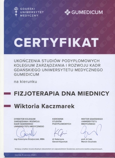 Jaki jest zakres porad oferowanych przez Wiktoria Kaczmarek?Wiktoria Kaczmarek to fizjoterapeuta. Na podstawie swojego doświadczenia i wykształcenia Wiktoria Kaczmarek oferuje usługi takie jak: konsultacja fizjoterapeutyczna, Konsultacja uroginekologiczna, Terapia blizny, Terapia blizny po cesarskim cięciu, Mobilizacja blizny, rehabilitacja uroginekologiczna, diagnostyka i terapia mięśni dna miednicy, Terapia uroginekologiczna, ćwiczenia, Badanie uroginekologiczne.