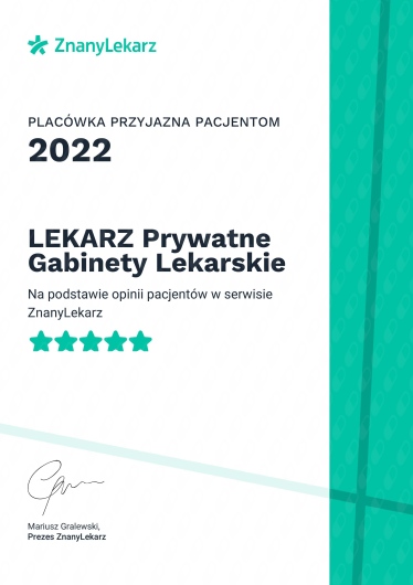Administratorem danych osobowych jest ZnanyLekarz sp. z o.o. z siedzibą w Warszawie przy ul. Kolejowej 5/7. Informujemy, że po przekazaniu przez nas Twoich danych osobowych wybranemu przez Ciebie Profesjonaliście, staje się on również administratorem Twoich danych osobowych i przetwarza je w celach związanych ze świadczeniem usług medycznych lub innych podobnych.