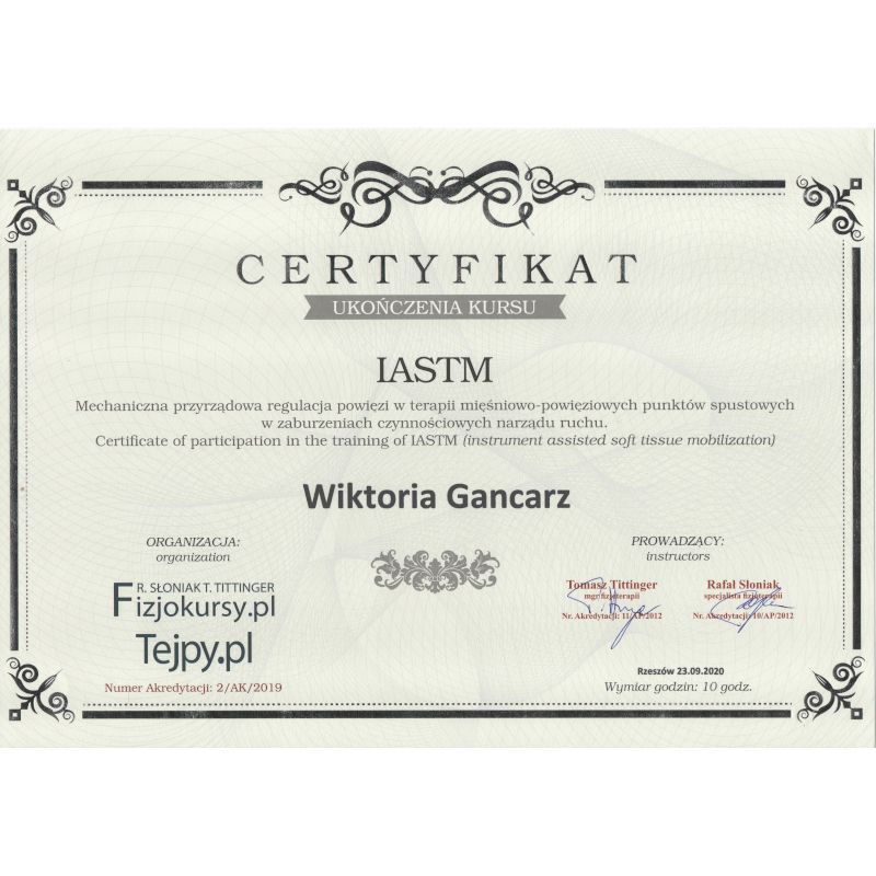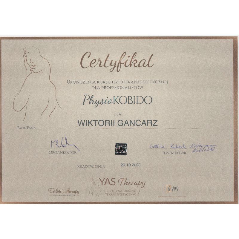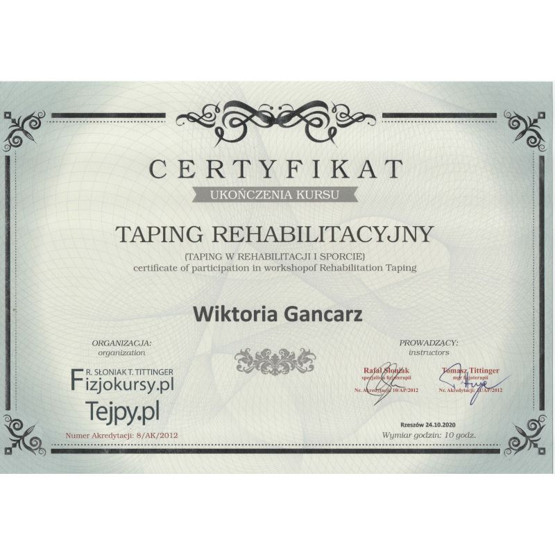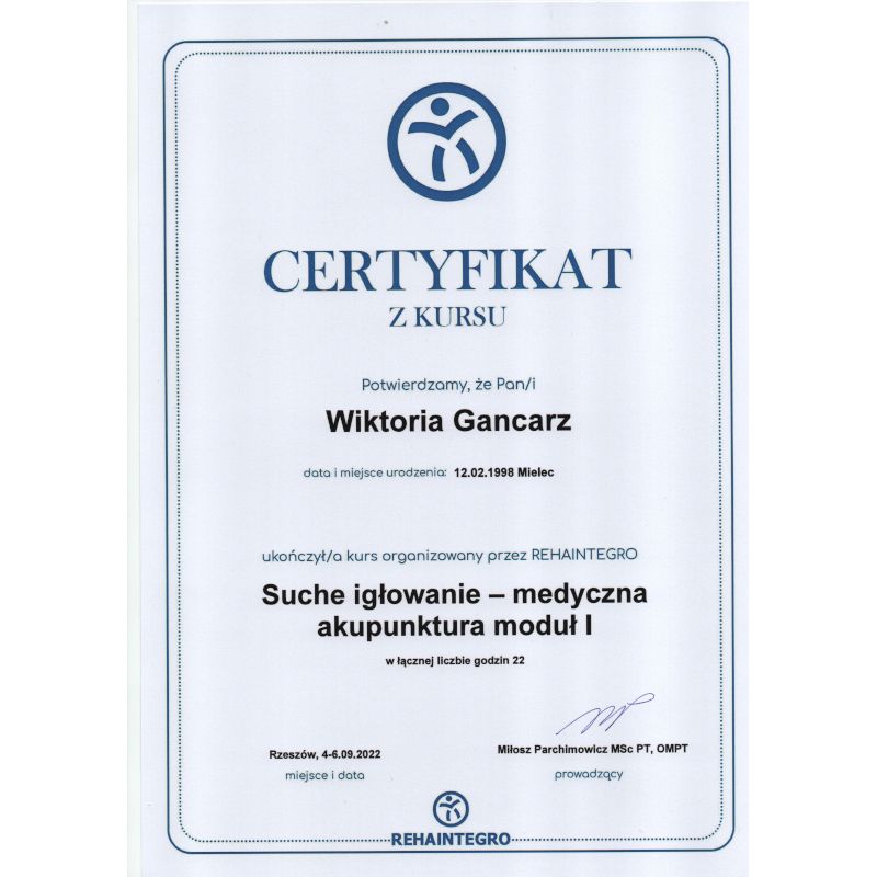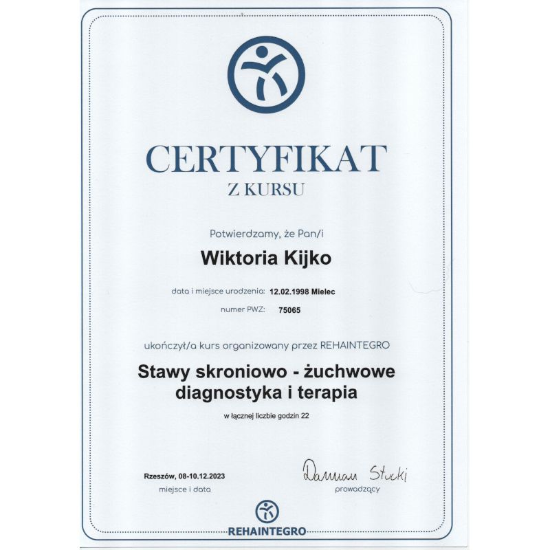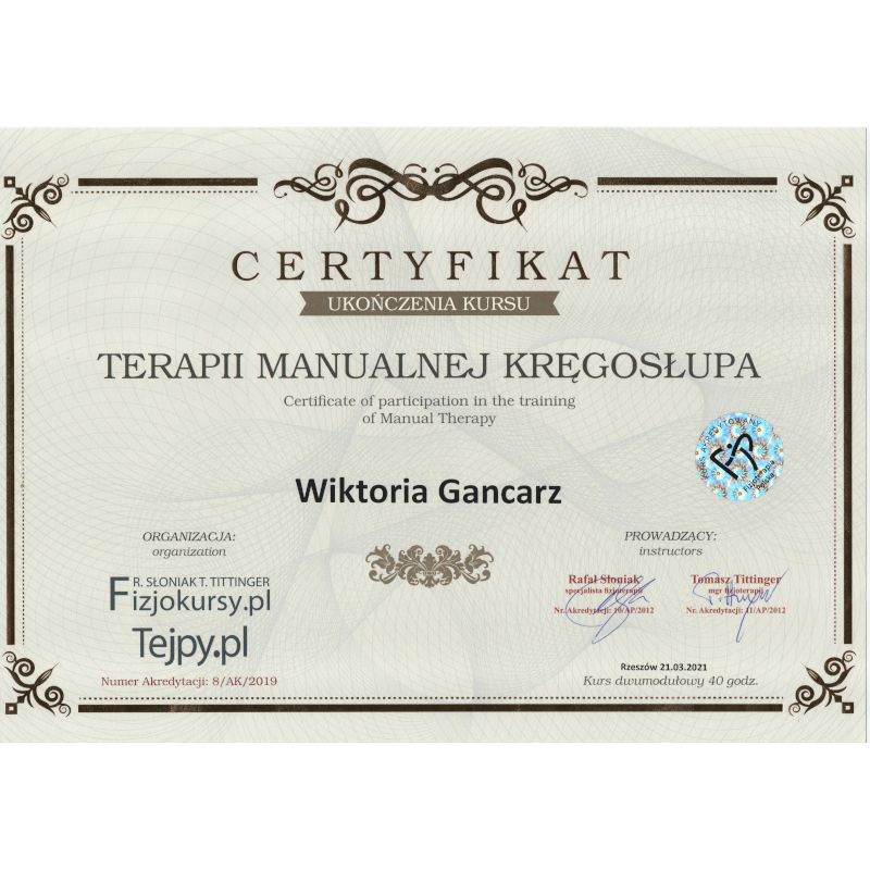 Fizjoterapia to dla mnie nie tylko zawód – to pasja, która motywuje mnie do ciągłego rozwoju. Ukończyłam 5-letnie studia magisterskie na Uniwersytecie Rzeszowskim, a od tamtej pory nie przestaję się szkolić. Każdy kurs to dla mnie nowa perspektywa, dzięki której mogę jeszcze lepiej pomagać moim pacjentom.