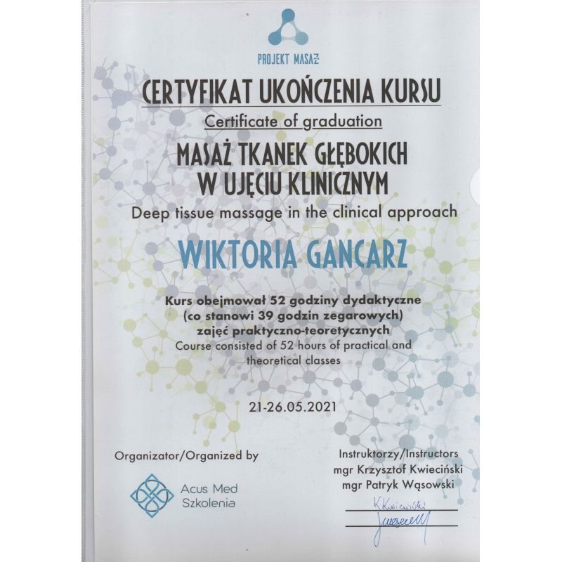 Poznałam Panią Wiktorię około 1,5 roku temu mając migreny 20 dni w miesiącu, gdy ból to była moja codzienność. Zebrała wyczerpujący wywiad, zaproponowała odpowiednią terapię leczenia i zdziałała cuda - dzięki niej zapomniałam co to ból głowy. Co jakiś czas pojawiam się u Pani Wiktorii na rozluźnienie mięśni czy z bieżącymi dolegliwościami. Z całego serca polecam: ogromna wiedza, doświadczenie oraz pasja.