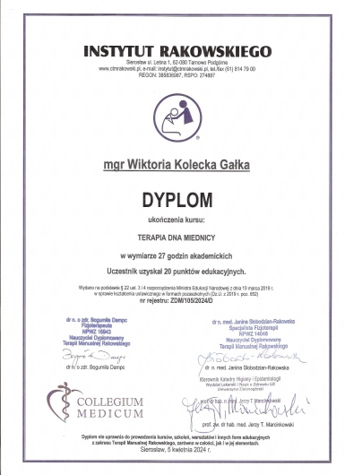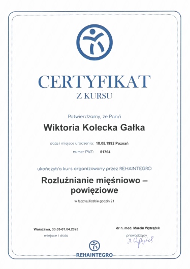 Posiadam wpis w Krajowym Rejestrze Fizjoterapeutów pod numerem 51764, gdzie znajdą Państwo potwierdzenie moich kwalifikacji i prawa do wykonywania zawodu fizjoterapeuty.