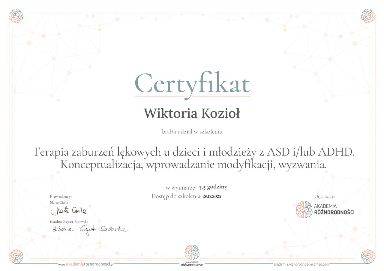 Opinię psychologiczną – na prośbę rodzica, mogę wydać po odbyciu minimum kilku spotkań, które pozwalają mi na rzetelną ocenę funkcjonowania dziecka.