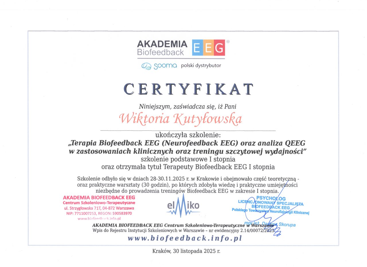 Jestem psychologiem oraz certyfikowaną terapeutką EEG Biofeedback. Pracuję z dziećmi, młodzieżą i osobami dorosłymi. Każdą osobę obejmuję indywidualnym podejściem, dostosowując metody i techniki pracy do jej aktualnych potrzeb.