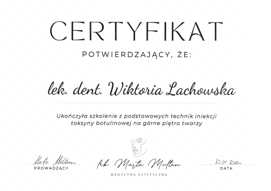 Jaki jest zakres porad oferowanych przez Wiktoria Lachowska?Wiktoria Lachowska to stomatolog, lekarz wykonujący zabiegi medycyny estetycznej. Na podstawie swojego doświadczenia i wykształcenia Wiktoria Lachowska oferuje usługi takie jak: Konsultacja stomatologiczna, konsultacja stomatologiczna dzieci, badania diagnostyczne, Konsultacja z zakresu medycyny estetycznej, znieczulenie przewodowe, znieczulenie nasiękowe, znieczulenie komputerowe, kompleksowe badanie stomatologiczne + plan leczenia + zdjęcie pantomograficzne, Zdjęcie 3D CBC, zdjęcie RTG.