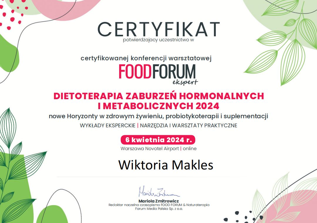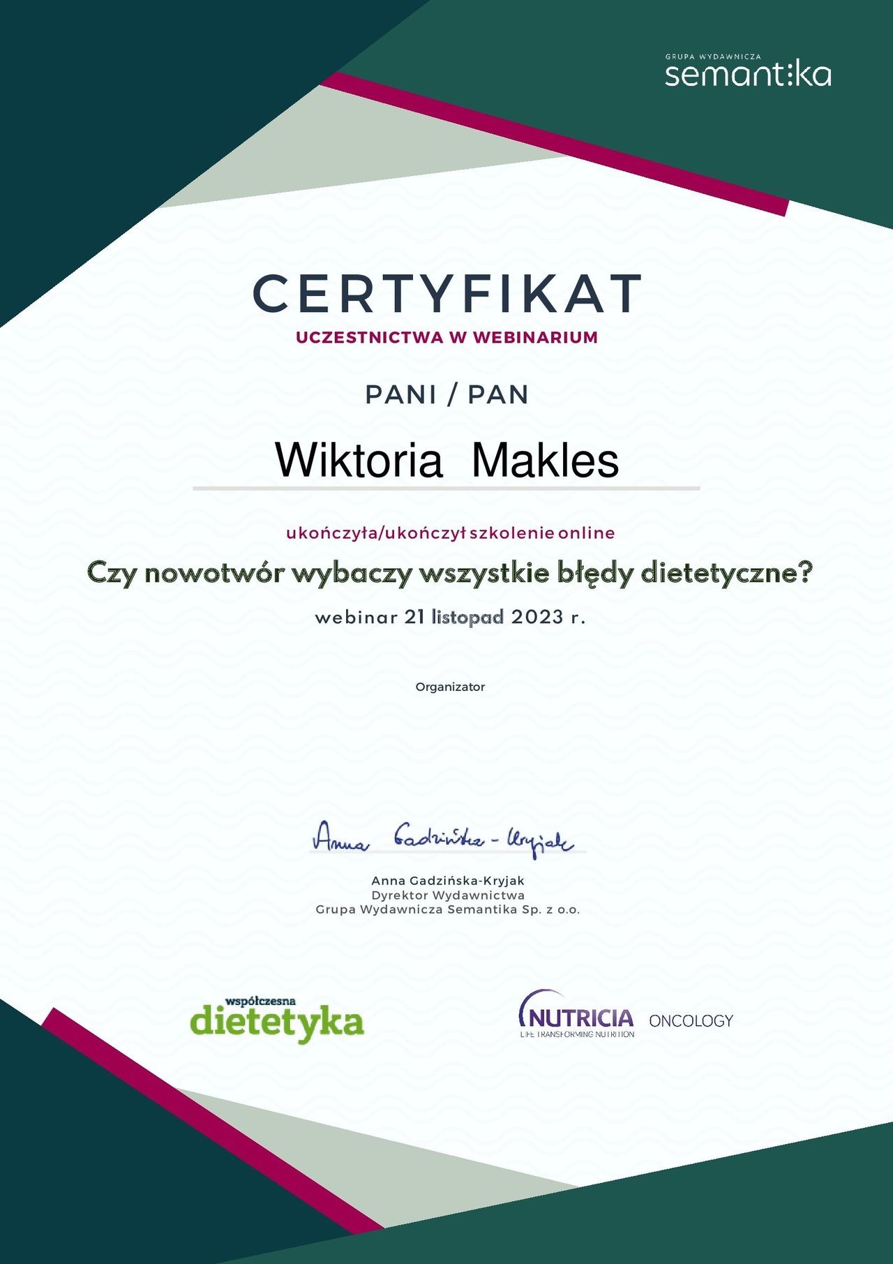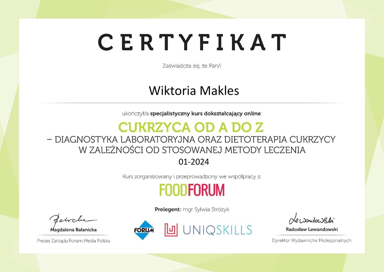 Polecam z całego serca panią Wiktorię Makles. Dzięki jej wsparciu i wskazówkom dużo łatwiej było mi wprowadzić zdrowe nawyki, a efekty pojawiły się szybciej, niż się spodziewałam. Jest osobą bardzo kompetentną, cierpliwą i zaangażowaną – potrafi motywować i wszystko jasno wyjaśnia. Widać, że zależy jej na pacjencie i naprawdę można czuć się zaopiekowanym.
