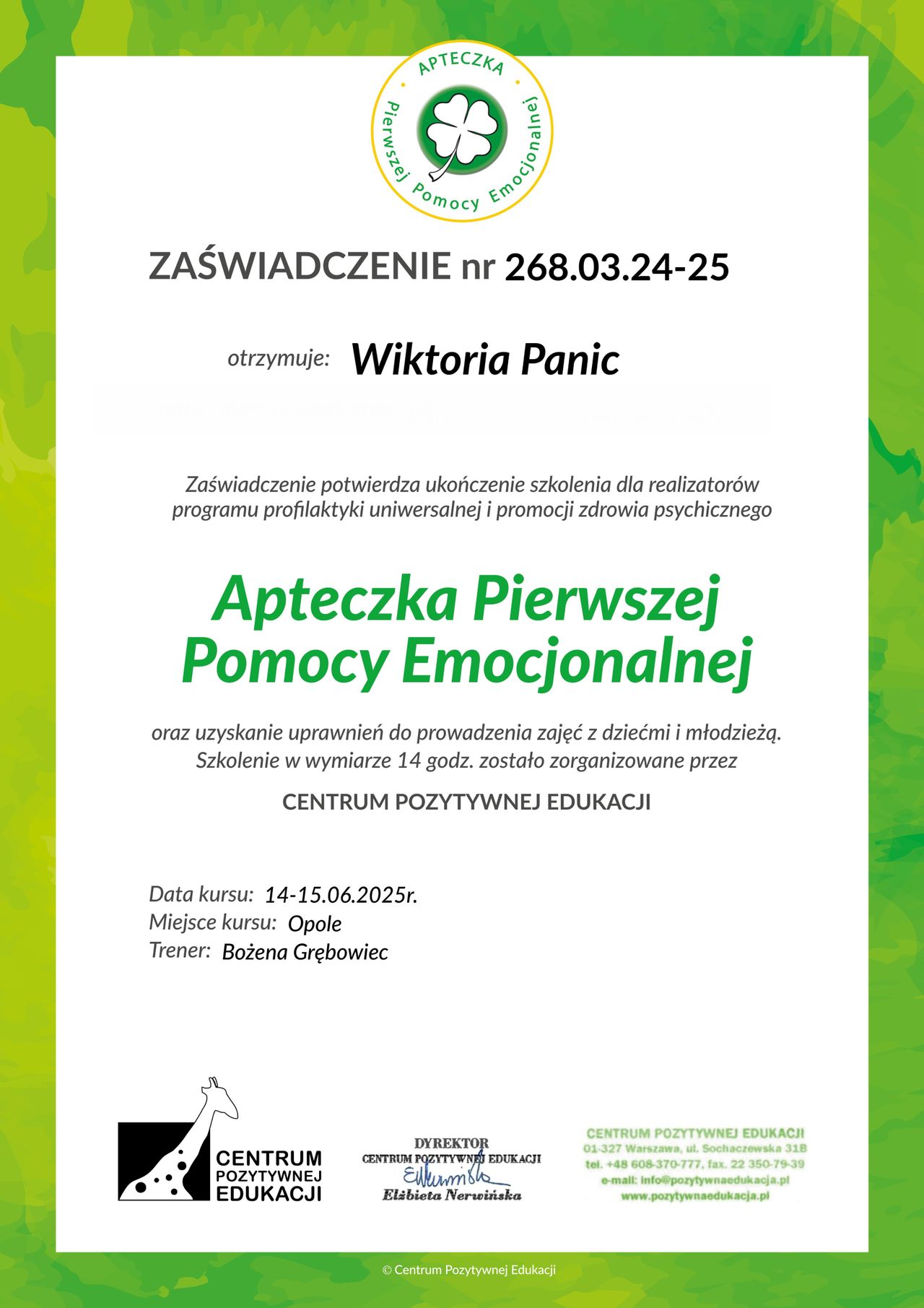 Stale podnoszę swoje kwalifikacje, uczestnicząc w specjalistycznych kursach, szkoleniach, webinarach oraz studiach podyplomowych. Pracuję pod regularną superwizją i interwizją, co pozwala mi świadczyć pomoc na wysokim poziomie merytorycznym i etycznym.