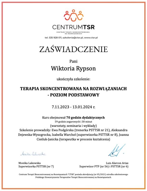 Pani Wiktoria jest osobą empatyczną, uważnie słuchającą i trafnie zadającą pytania, które pomogły mi lepiej zrozumieć własne emocje. Czułam się wysłuchana i potraktowana z szacunkiem. Całe spotkanie było dla mnie niezwykle kojące i czuję, że dostałam więcej bezpieczeństwa i ciepła niż gdziekolwiek wcześniej.