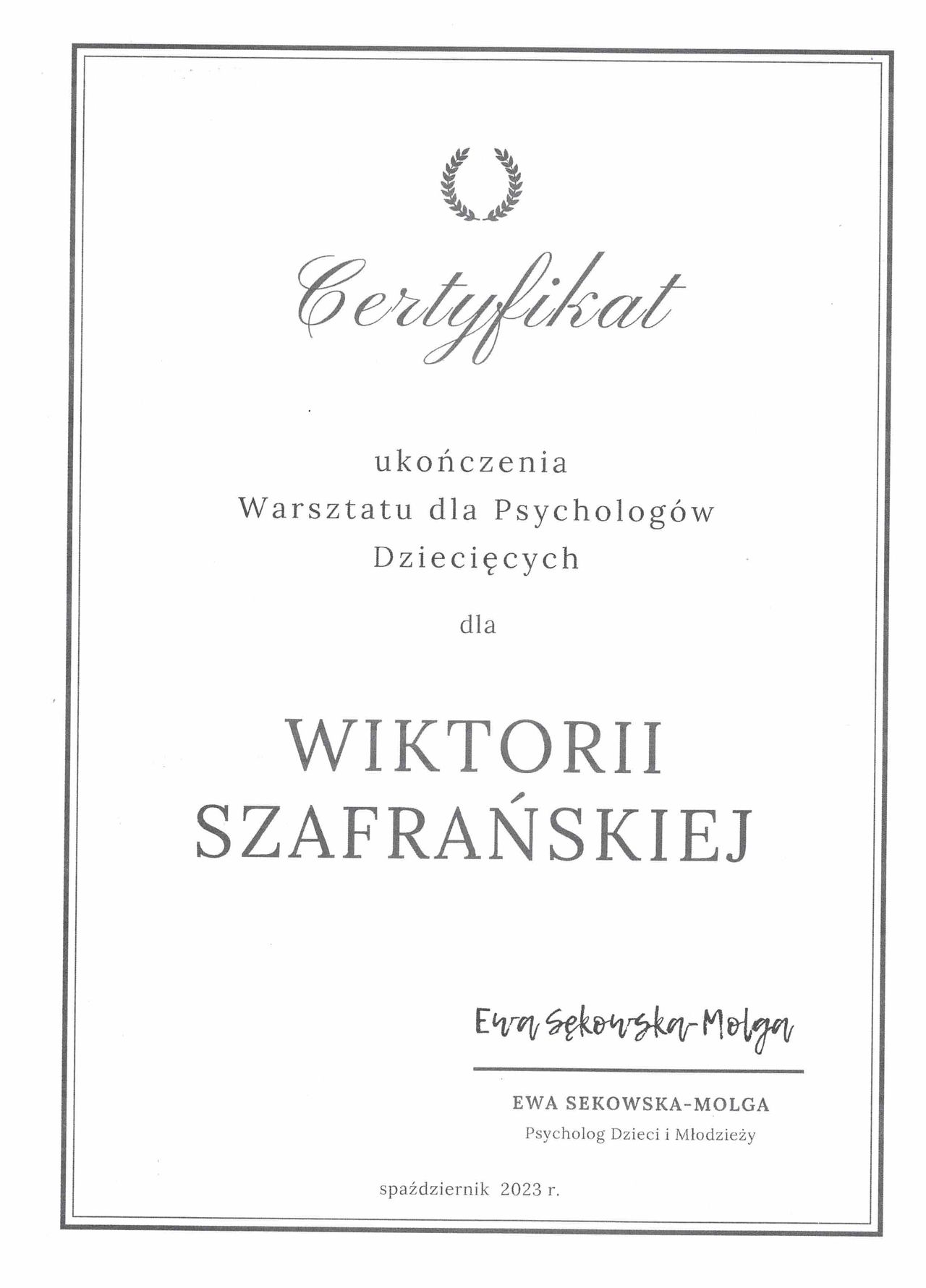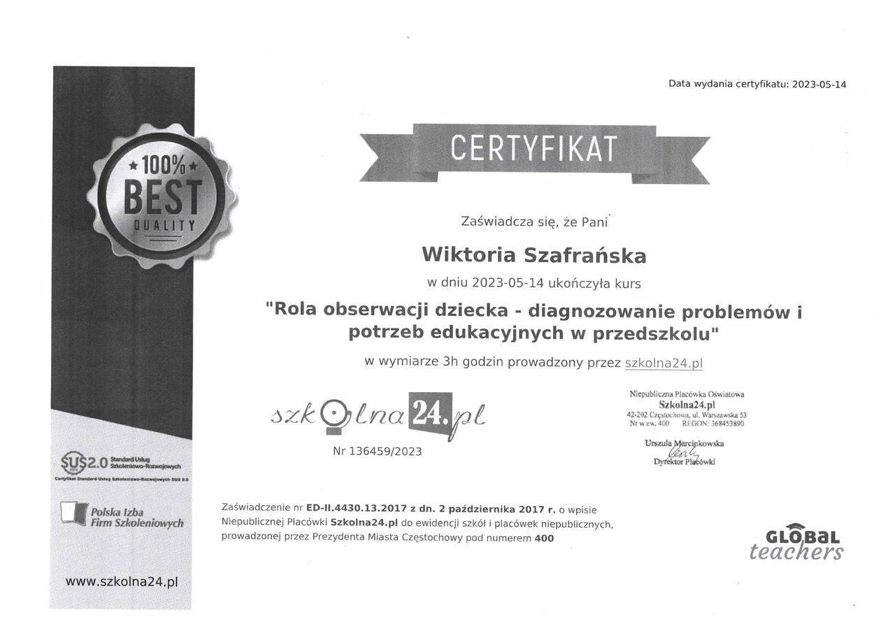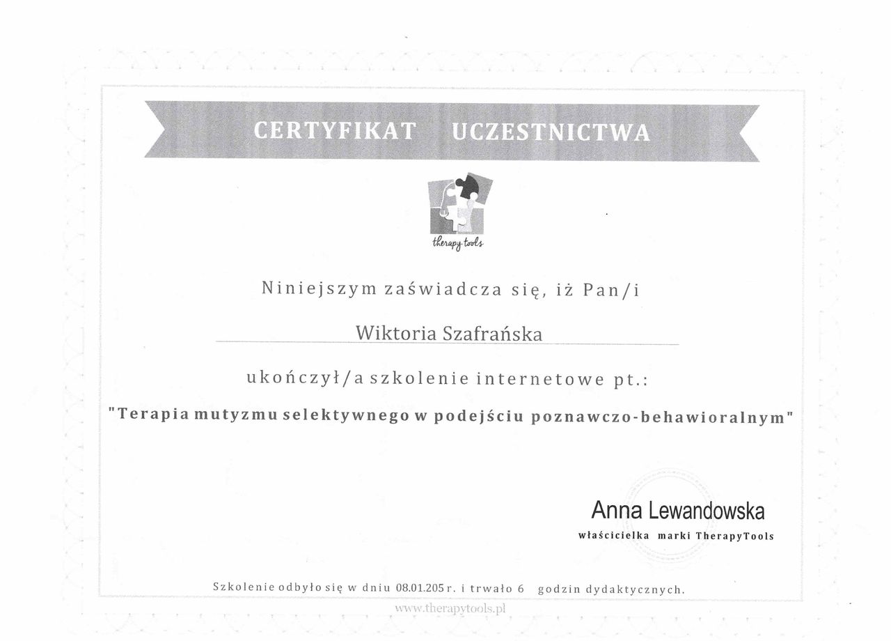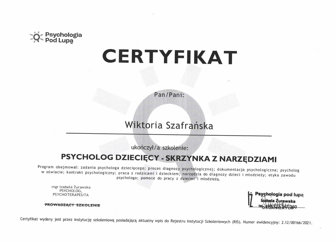 Jestem psychologiem dziecięcym, absolwentką studiów magisterskich o specjalności psychologia kliniczna. Ukończyłam także studia podyplomowe z zakresu przygotowania pedagogicznego oraz diagnozy, terapii i edukacji dzieci ze spektrum autyzmu.