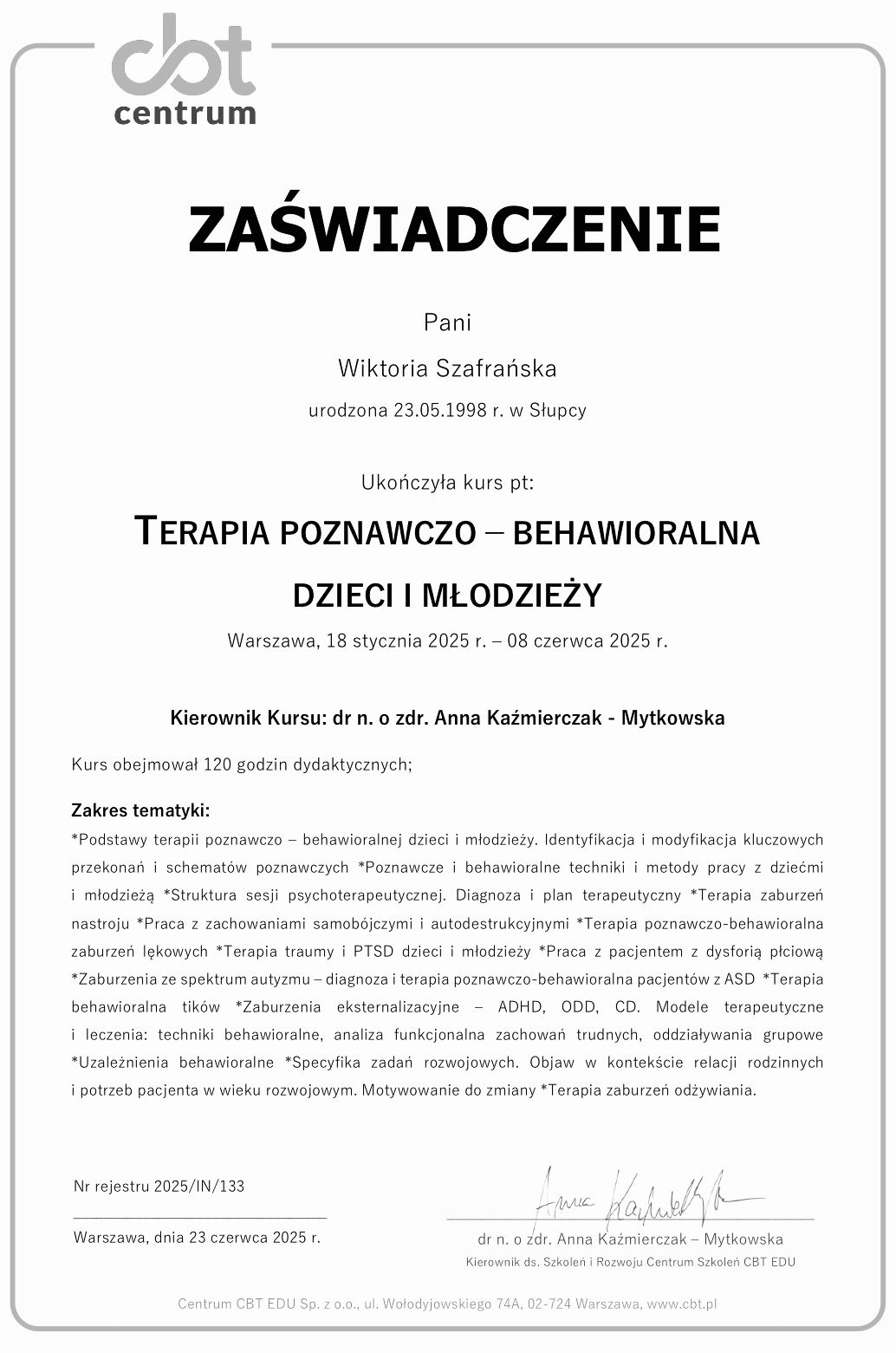 Pracuję zgodnie z zasadami Kodeksu Etyczno-Zawodowego Psychologa.