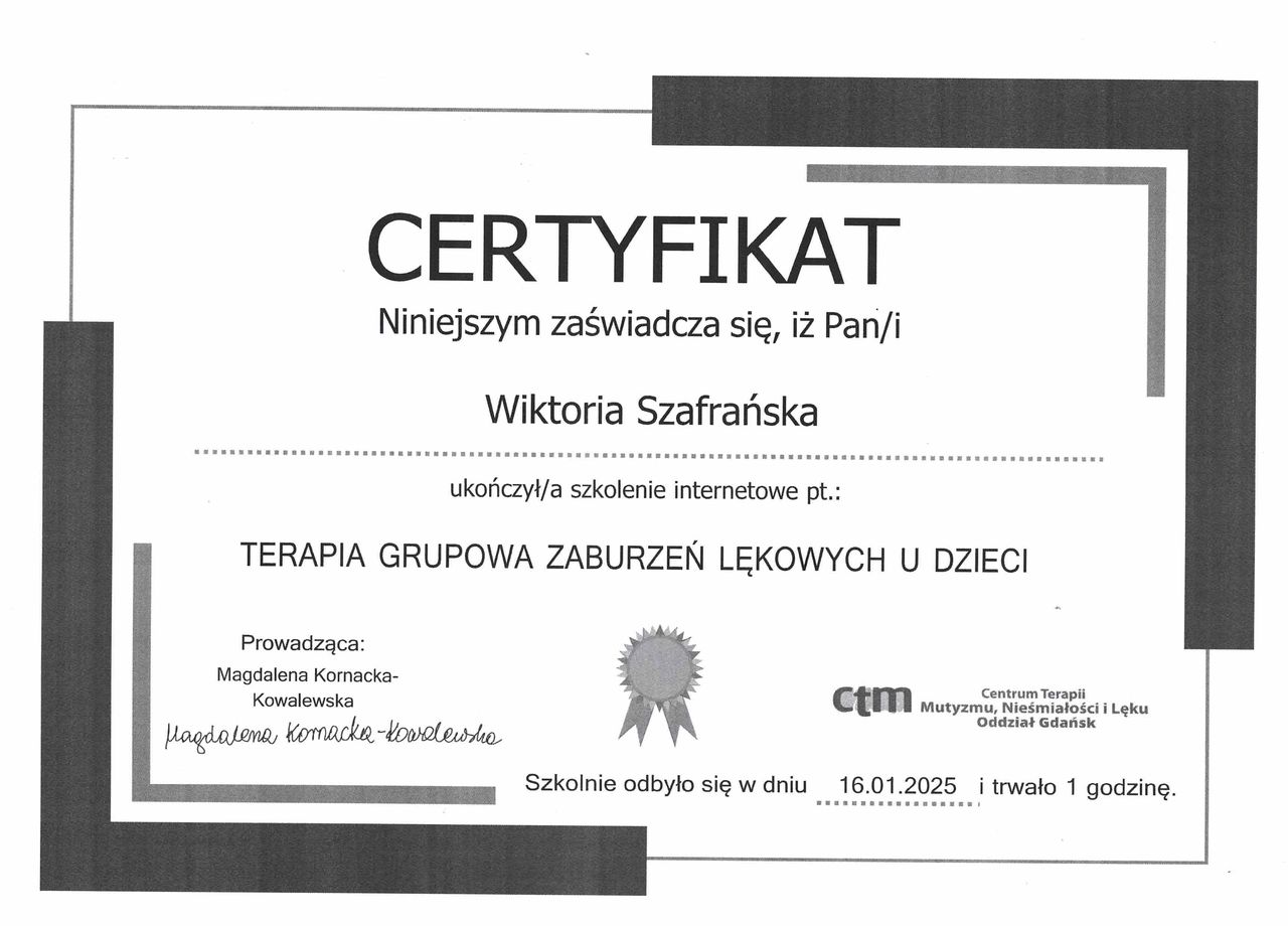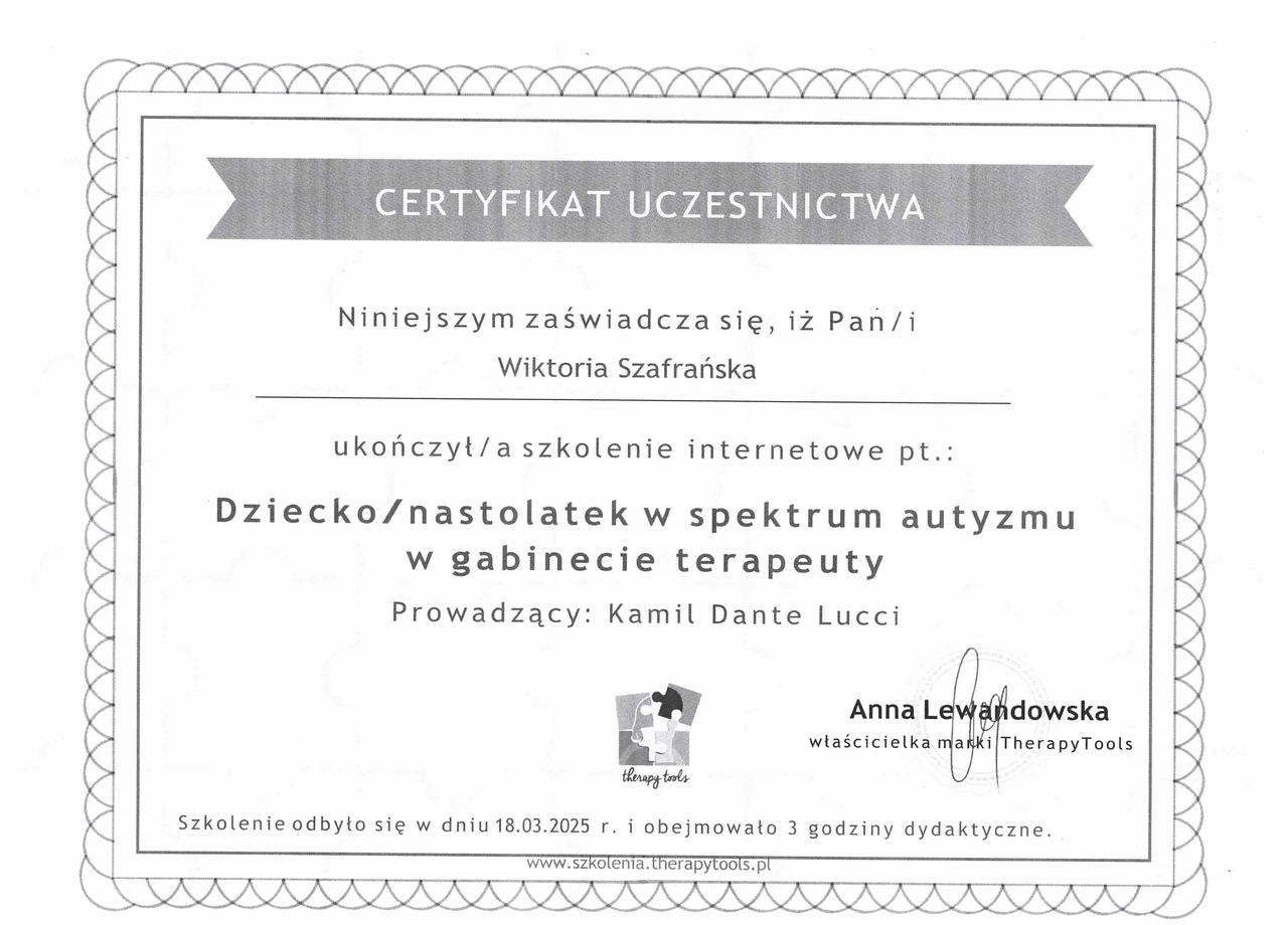 Jestem certyfikowanym terapeutą integracji sensorycznej (I i II stopnia), terapeutą ręki oraz trenerem Treningu Umiejętności Społecznych (TUS). Mam doświadczenie w pracy z wykorzystaniem komunikacji alternatywnej i wspomagającej (AAC) oraz stosowaniu technik Stosowanej Analizy Zachowań (SAZ) z osobami przejawiającymi zachowania trudne.