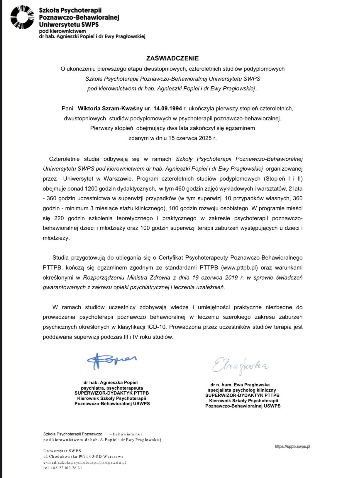 Gdzie Wiktoria Szram-Kwaśny ma swój gabinet?Wiktoria Szram-Kwaśny przyjmuje pod adresem: