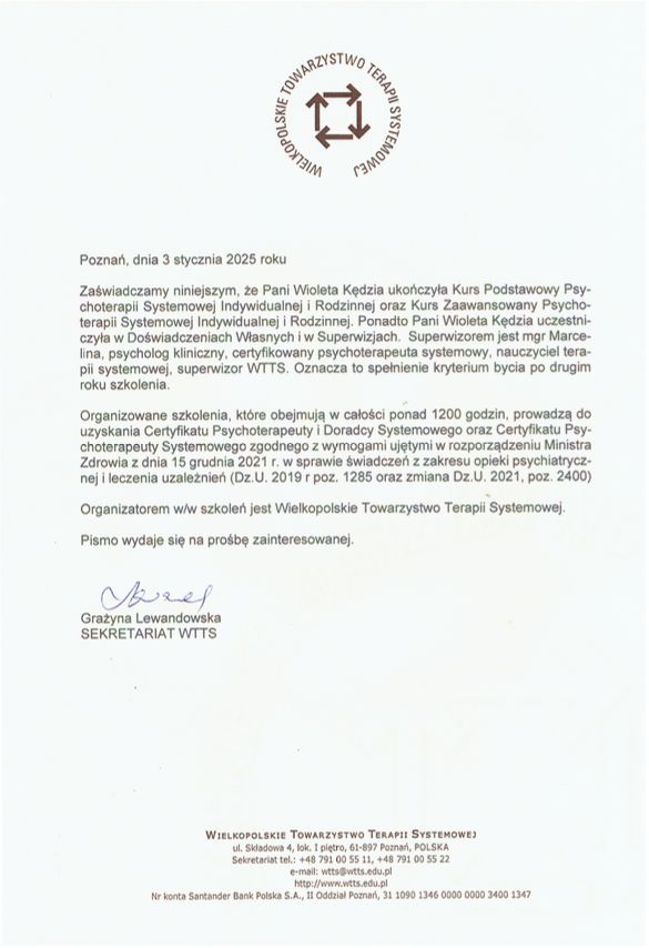 Ukończyła Kurs Podstawowy Psychoterapii Systemowej Indywidualnej i Rodzinnej oraz Kurs Zaawansowany Psychoterapii Systemowej Indywidualnej i Rodzinnej. Jako Nadzwyczajny Członek Wielkopolskiego Towarzystwa Terapii Systemowej dba o ciągły rozwój umiejętności psychoterapeuty, biorąc czynny udział w Superwizjach, Warsztatach, Szkoleniach i innych formach samokształcenia w Wielkopolskim Towarzystwie Terapii Systemowej, które prowadzą do uzyskania Certyfikatu Psychoterapeuty i Doradcy Systemowego oraz Certyfikatu Psychoterapeuty Systemowego zgodnego z wymogami ujętymi w rozporządzeniu Ministra Zdrowia z dnia 15 grudnia 2021r. w sprawie świadczeń z zakresu opieki psychiatrycznej i leczenia uzależnień (Dz. U. 2019 r poz 1285 oraz zmiana Dz. U. 2021 poz. 2400).