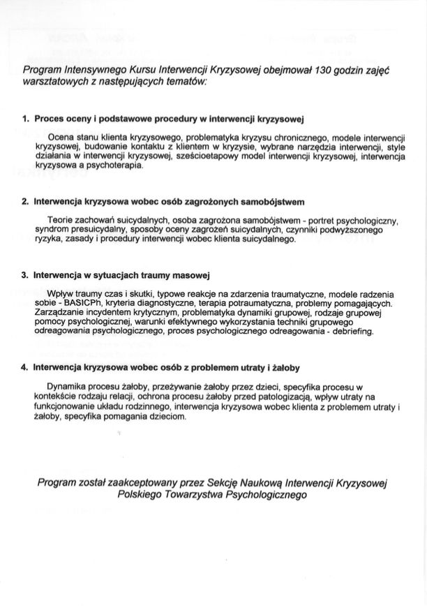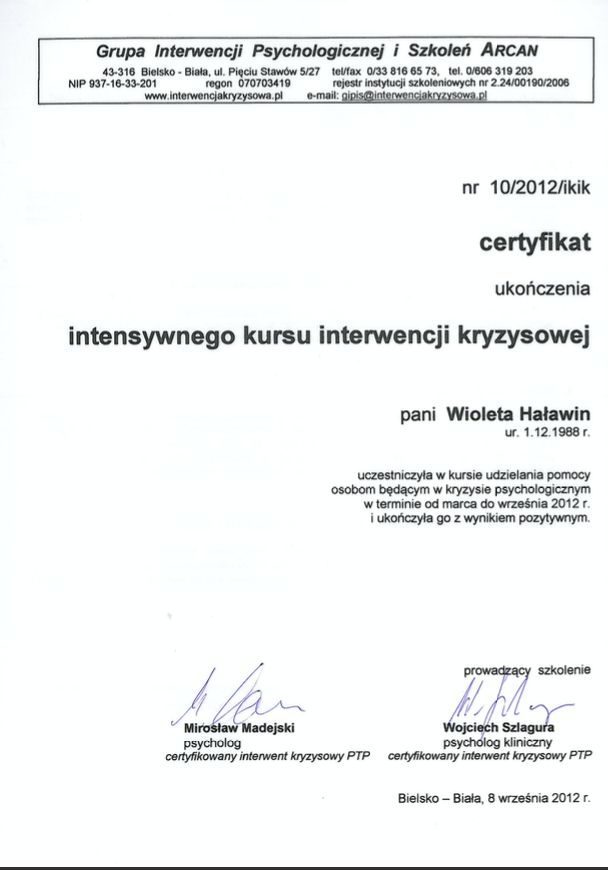 Uzyskała certyfikat Interwenta Kryzysowego podczas Kursu Interwencji Kryzysowej w Grupie Interwencji Psychologicznej i Szkoleń ARCAN w Bielsku-Białej zaakceptowany przez Sekcję Naukową Interwencji Kryzysowej Polskiego Towarzystwa Psychologicznego.