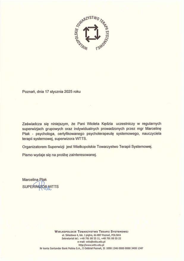 Z pełnym przekonaniem mogę stwierdzić, że Pani Wioleta to doskonała terapeutka, pełna empatii, wrażliwości, otwartości na drugiego człowieka. Pani Wioleto, z całego serca dziękuję za Pani pomoc w tak trudnych dla mnie chwilach, zaangażowanie podczas terapii i stworzoną atmosferę zaufania. Dziękuję także za Pani celne pytania, jak i wskazówki, dzięki którym inaczej patrzę na świat i ludzi.