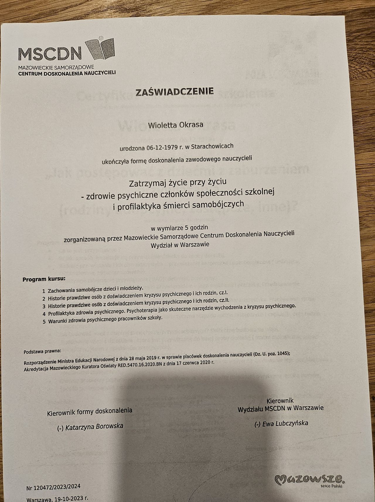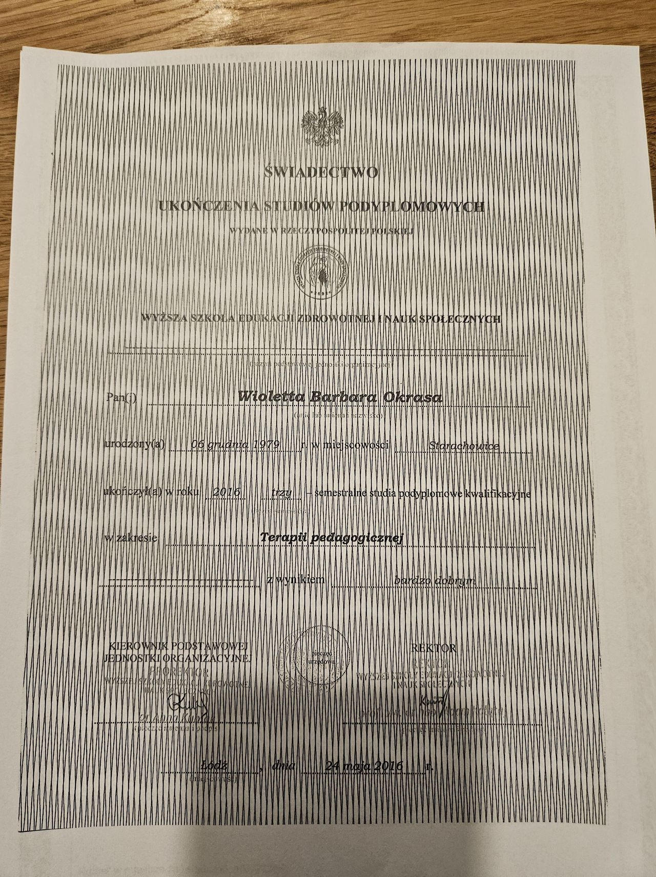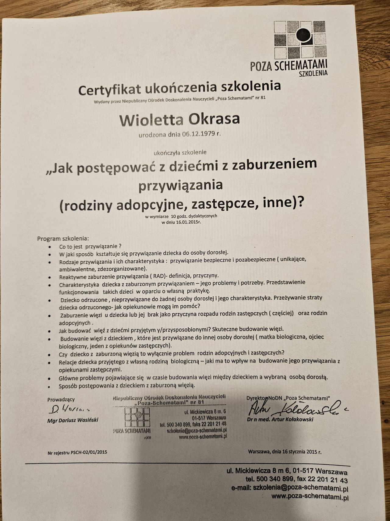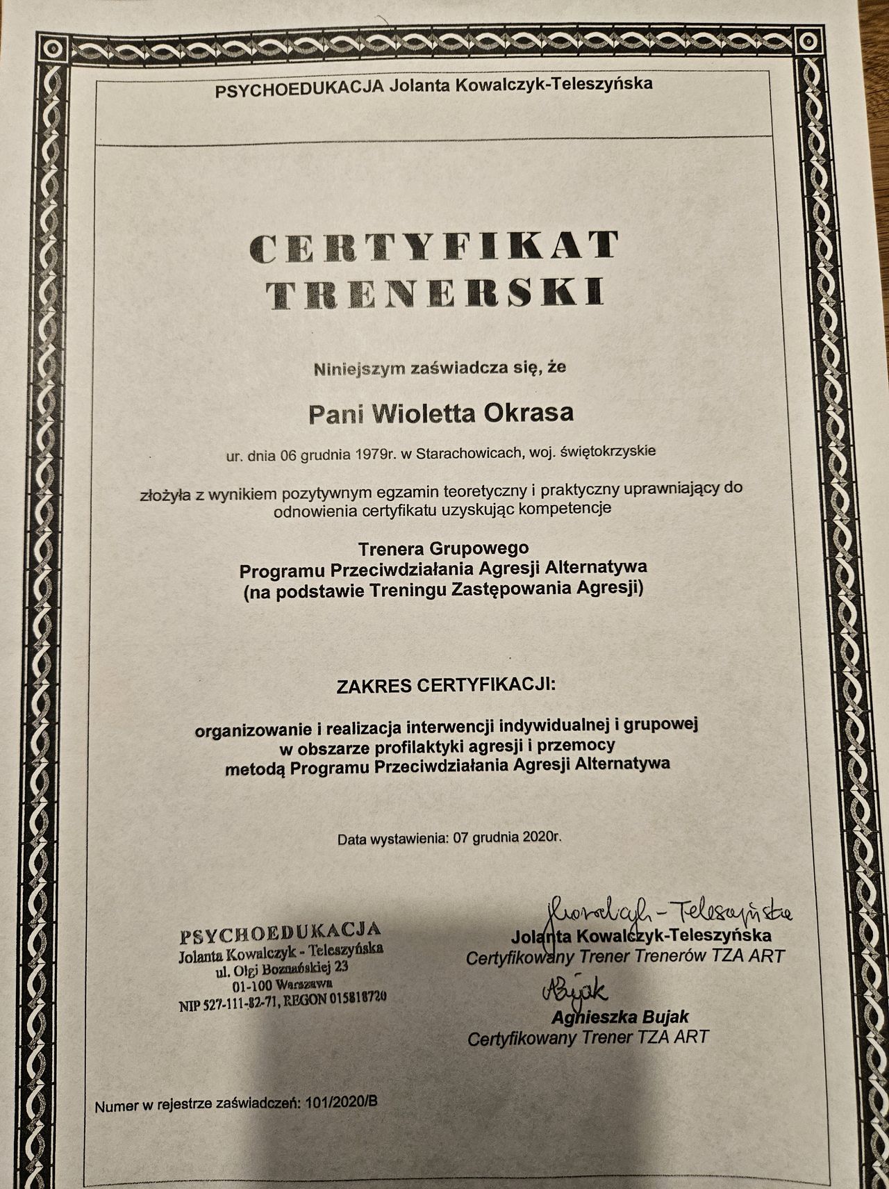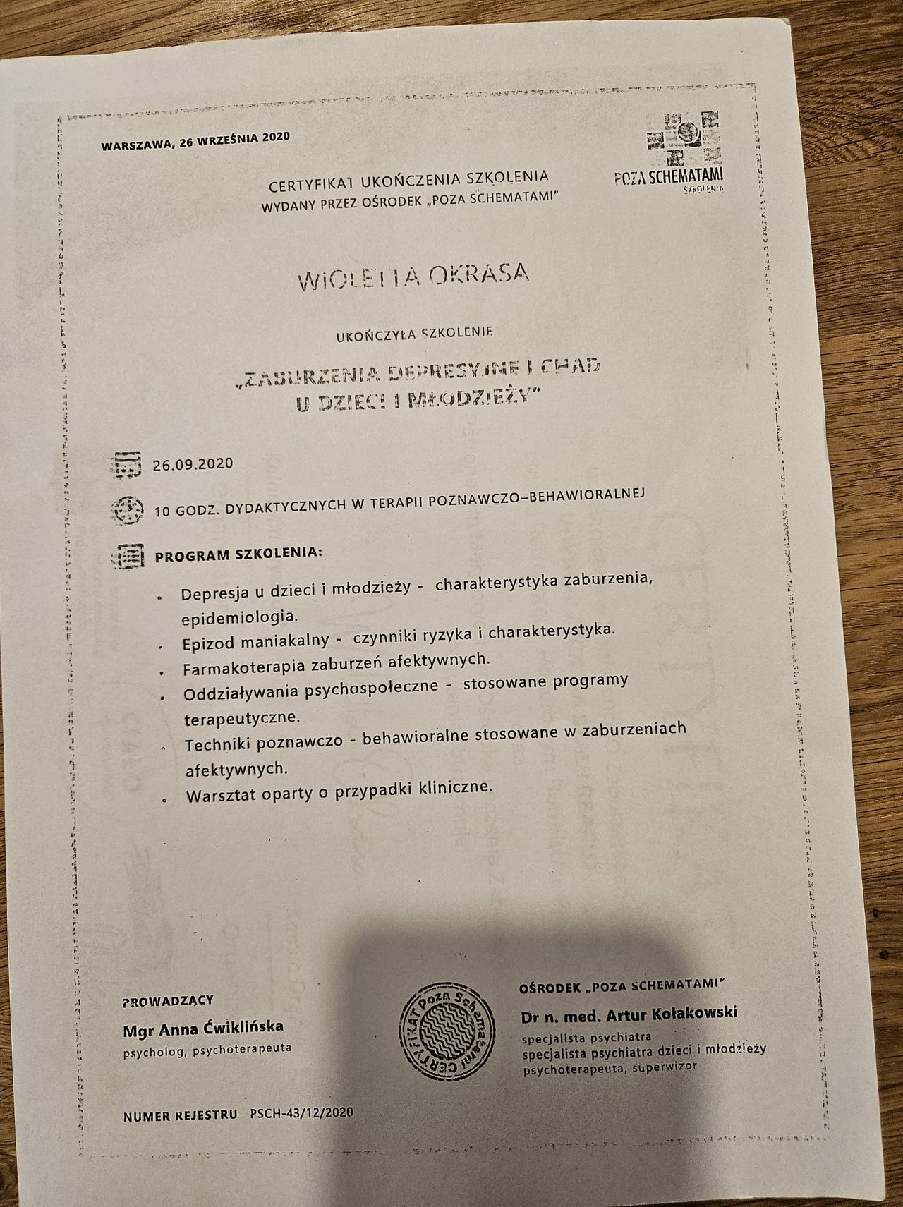 Jaki jest zakres porad oferowanych przez Wioletta Okrasa?Wioletta Okrasa to psycholog, psychotraumatolog. Na podstawie swojego doświadczenia i wykształcenia Wioletta Okrasa oferuje usługi takie jak: Konsultacja psychologiczna, Konsultacja psychologiczna dla młodzieży, konsultacja psychologiczna dzieci, psychoterapia par i małżeństw, terapia rodzinna, konsultacja psychologiczna rozwód, konsultacja psychotraumatologiczna, Psychoterapia, psychoterapia depresji, terapia autyzmu.