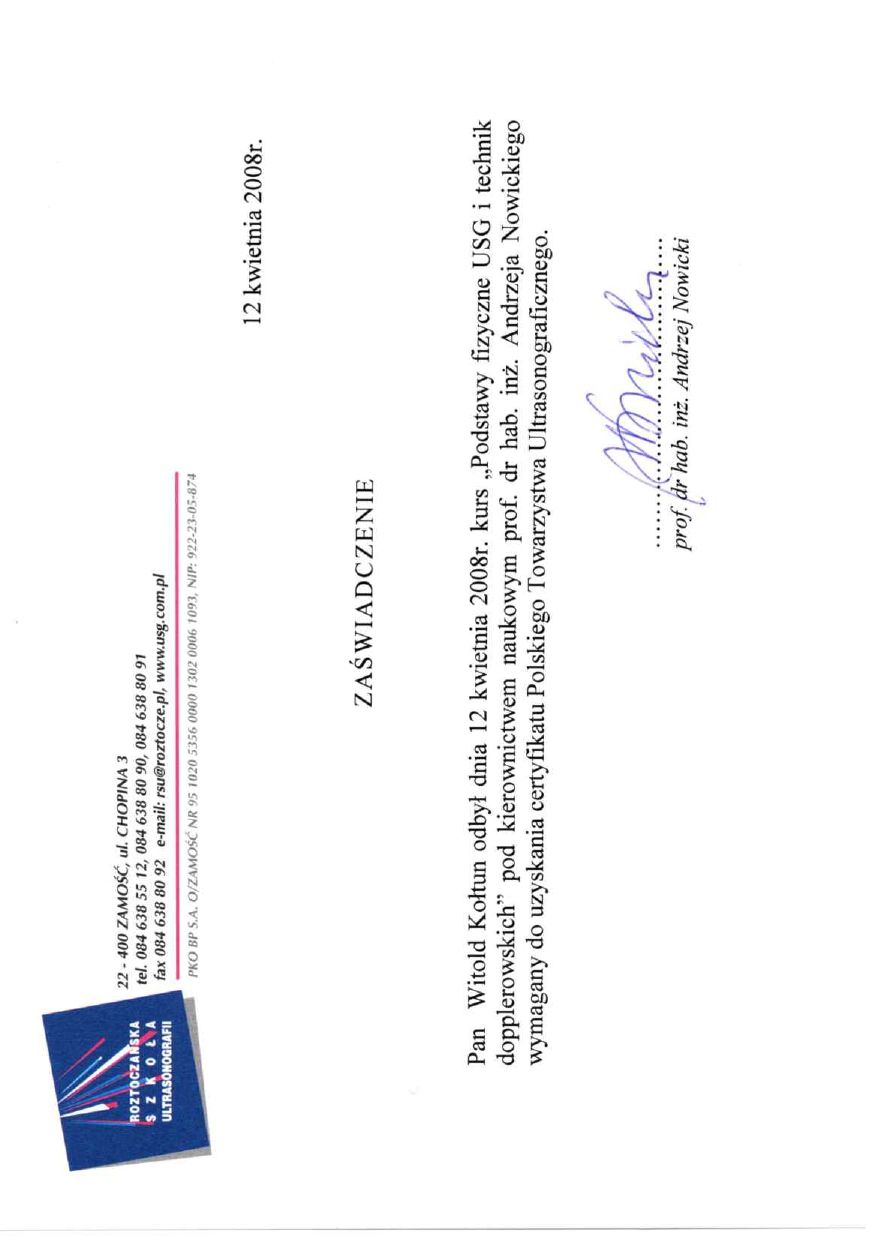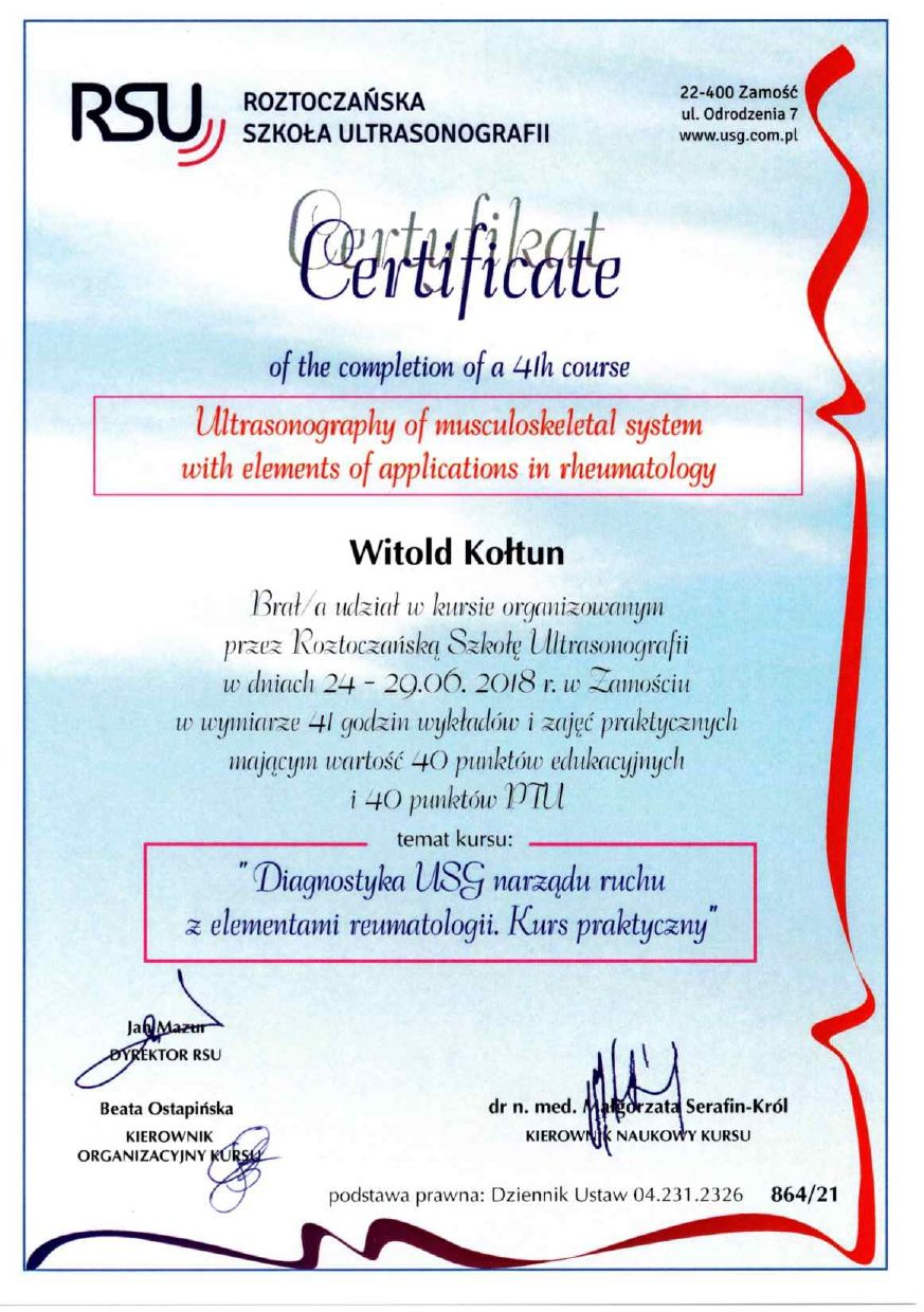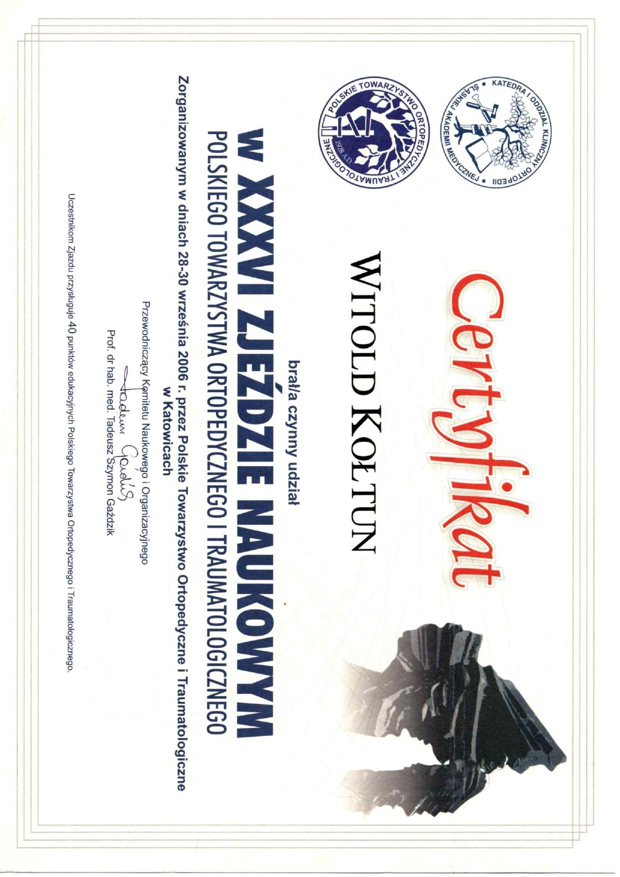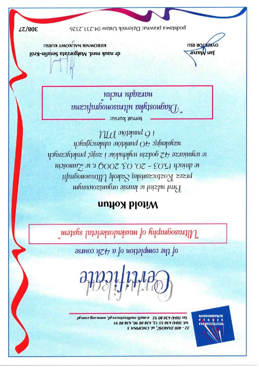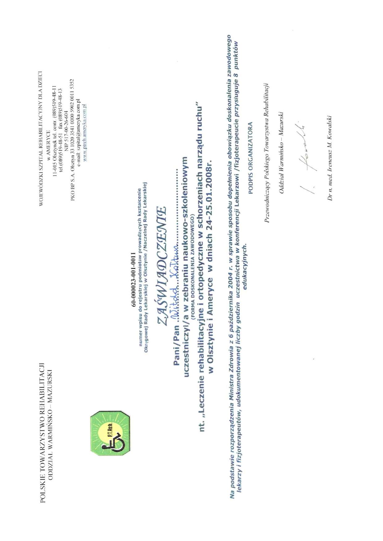 Posiadam liczne certyfikaty z odbytych szkoleń, które pozwalają na wdrażanie nowoczesnych standardów medycznych w postępowaniu lekarskim. Ponadto jestem członkiem towarzystw PTOiTR oraz PFAS-PASA. Aktywnie działam na rzecz Warmińsko - Mazurskiej Izby Lekarskiej w Olsztynie.