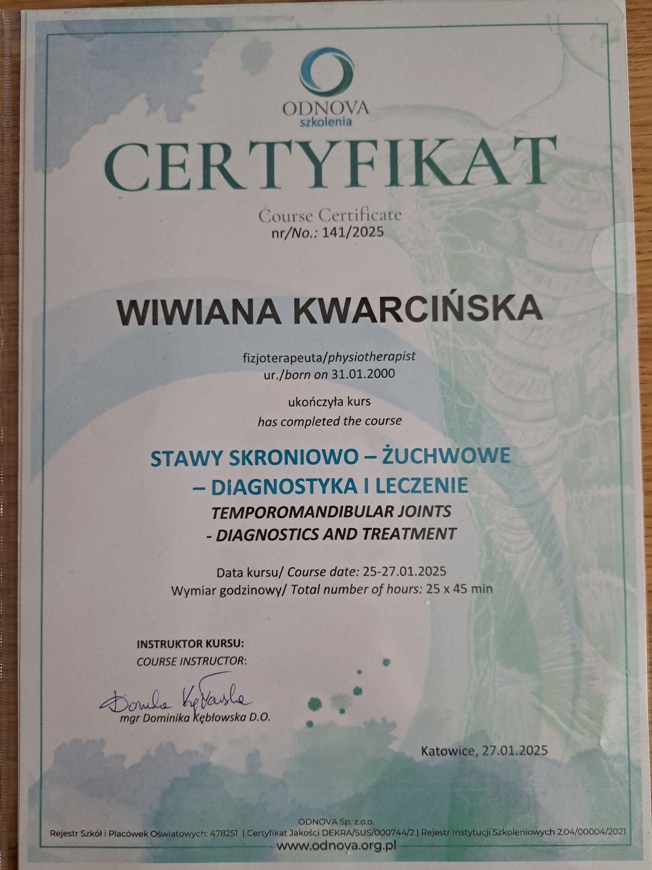 Nazywam się Wiwiana Kwarcińska. Uzyskałam tytuł magistra fizjoterapii na Śląskim Uniwersytecie Medycznym w Katowicach. Jestem również technikiem masażystą. Już na studiach zafascynowała mnie fizjoterapia stomatologiczna oraz ortopedyczna - szczególnie praca z barkiem i kolanem.