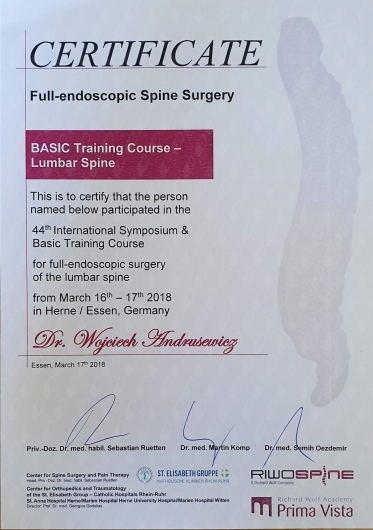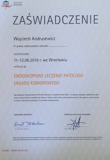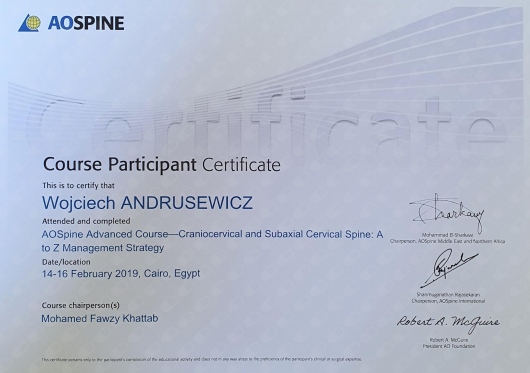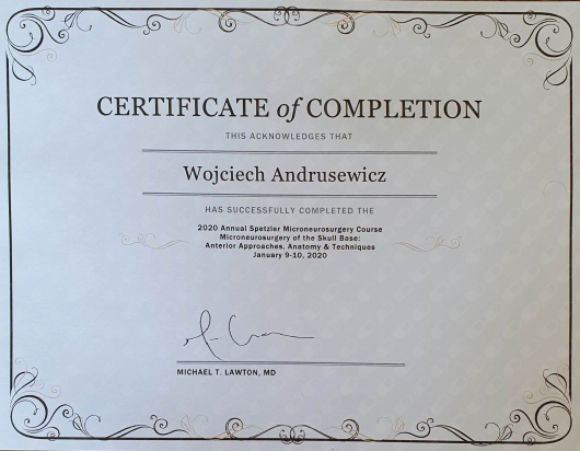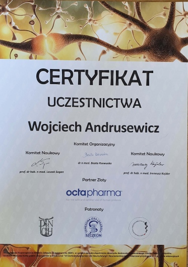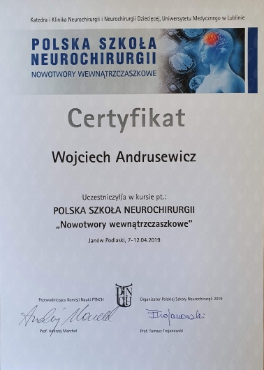 Swoją wiedzę i umiejętności praktyczne doskonalę regularnie na krajowych i zagranicznych kursach oraz szkoleniach. Jestem członkiem Polskiego Towarzystwa Neurochirurgicznego oraz autorem i współautorem prezentacji wygłaszanych w ramach zjazdów PTNch oraz Zachodniopomorskich Dni Neurochirurgii i Neuroanestezjologii.