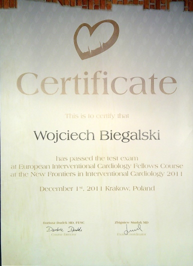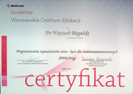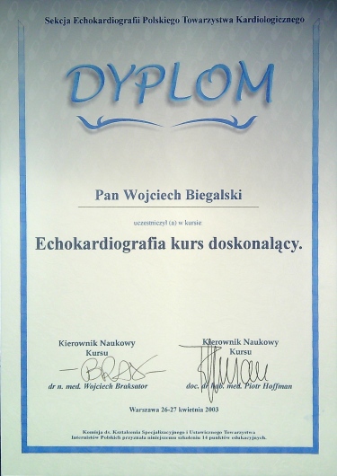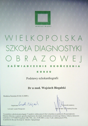 W 2006 roku uzyskałem tytuł doktora nauk medycznych na podstawie pracy doktorskiej pt.: „Echokardiograficzna ocena funkcji prawej komory u chorych z niewydolnością serca”.