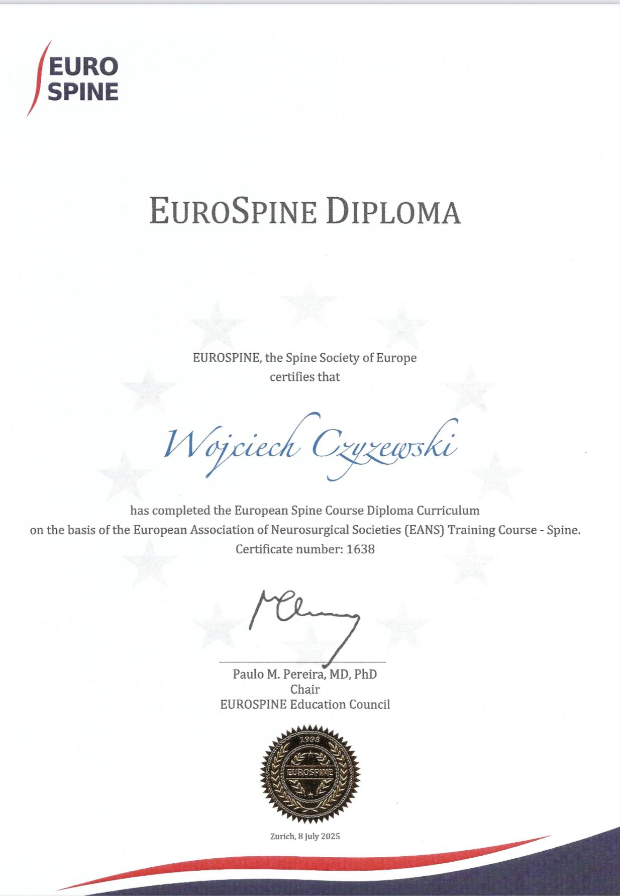 Neurochirurg lek. Wojciech Czyżewski, specjalista pracujący na co dzień w Klinice Nowotworów Układu Nerwowego Narodowego Instytutu Onkologii w Warszawie oraz w pododdziale Neurochirurgi Powiatowego Szpitala Specjalistycznego w Stalowej Woli. W latach 2015-2023 związany z Kliniką Neurochirurgii i Neurochirurgii Dziecięcej Samodzielnego Publicznego Szpitala Klinicznego nr 4 w Lublinie. W 2023 roku ukończył studia doktoranckie w Katedrze i Zakładzie Dydaktyki i Symulacji Medycznej Uniwersytetu Medycznego w Lublinie broniąc z wyróżnieniem pracę doktorską zatytułowaną "Analiza wybranych akwaporyn u pacjentów z krwiakami podtwardówkowymi ostrymi i przewlekłymi". Autor licznych publikacji w czasopismach polskich i zagranicznych z zakresu neurotraumatologii, chirurgii kręgosłupa oraz neuroonkologii. Obszary zainteresowania: - neuroonkologia - choroby naczyniowe ośrodkowego układu nerwowego - chirurgia nerwów obwodowych - chirurgia kręgosłupa dr n. med. Wojciech Czyżewski jest członkiem Europejskiego Stowarzyszenia Neurochirurgów EANS oraz uczestnikiem wielu kursów praktycznych i teoretycznych zarówno w Polsce, jak i za granicą Kursy teoretyczne: EANS Training Courses: Walencja 2021, Maastricht 2022, Porto 2023, Czechy 2024 Kursy praktyczne: 2019 Listopad – EANS Cranial Step 1, Hands-On Course, Brno 2019 Grudzień – White Matter Dissection Tours, Tours 2020 Luty – EANS Basic Endovascular Course, Berlin 2021 Czerwiec – EANS Microsurgery Course, Lyon 2022 Styczeń – EANS Spinal Step II, Hands-On Course, Lyon 2023 Marzec – Kurs Neurochirurgii Robotycznej, Filadelfia, Stany Zjednoczone 2022 Maj – EANS Spinal Step I, Hands-On Course, Genewa 2023 Marzec – Kurs Minimalnie Inwazyjnej Chirurgii Kręgosłupa, Bratysława, Słowacja 2023 Czerwiec - Kurs Minimalnie Inwazyjnej Chirurgii Kręgosłupa, Filadeldia, Stany Zjednoczone 2023 Lipiec - Zaawansowany Kurs Endoskopii Kręgosłupa, Knittlingen, Niemcy 2023 Listopad – EANS Cranial II, Hands-On Course Istambuł, Turcja 2023 Listopad – Kurs Neurochirurgii Funkcjonalnej, Queen’s Square Hospital, Londyn, Wielka Brytania 2023 Grudzień – 2024 Styczeń – Staż z Endoskopii Podstawy Czaszki, Szpital Uniwersytecki w Greifswald, Niemcy 2024 Czerwiec - Certyfikat Zaawansowanej Chirurgii Podstawy Czaszki - NewYork-Presbyterian | Weill Cornell Medical Center, Nowy York, USA 2024 Październik - Kurs Neuroendoskopii Wewnątrzczaszkowej - Tuttlingen, Niemcy 2024 Listopad - Certyfikat Endoskopowej Przeznosowej Chirurgii Podstawy Czaszki, Pittsburgh, PA, USA Konsultacje odbywają się w języku polskim bądź angielskim.