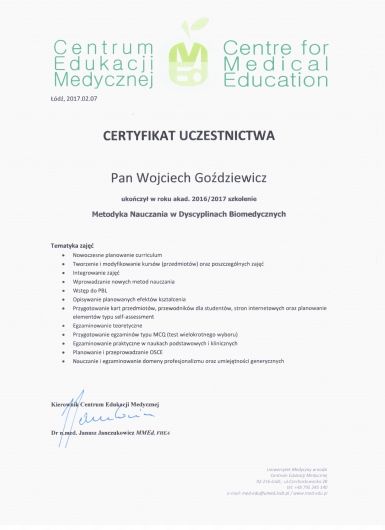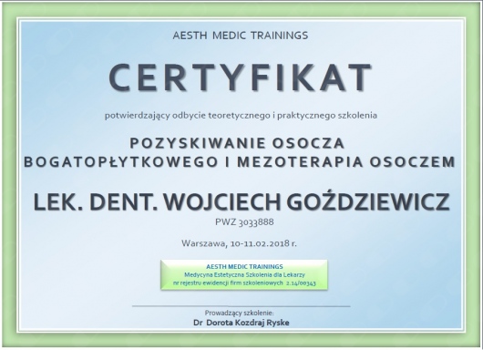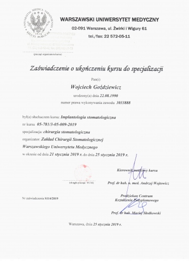 Ukończyłem wydział lekarsko-dentystyczny Uniwersytetu Medycznego w Łodzi, otrzymując nagrodę Rektora UM. Pracowałem jako asystent naukowy UM w Łodzi. W praktyce klinicznej specjalizuje się w bardzo szerokiej dziedzinie jaką jest chirurgia stomatologiczna. Przyjmuję w prywatnej klinice chirurgii stomatologicznej i implantologii Lisciasta88, gdzie zgłaszają się do mnie zarówno stali jak i pierwszorazowi pacjenci. Jestem współautorem prac naukowych, a główną tematyką moich dotychczasowych badań była ocena różnych metod stosowanych w stomatologii estetycznej, związanej z wybielaniem zębów. We wrześniu 2017 r. zwyciężyłem plebiscyt i otrzymałem prestiżową nagrodę - tytuł Dentysty Roku. Ukończyłem również półroczny staż specjalizacyjny z zakresu Chirurgii Szczękowo-Twarzowej w Uniwersyteckim Szpitalu klinicznym im. WAM. Stale poszerzam swoją wiedzę, uczestnicząc w szkoleniach i konferencjach w Polsce i za granicą, szczególnie z zakresu chirurgii stomatologicznej i medycyny estetycznej (wykonuje zabiegi z wykorzystaniem kwasu hialuronowego, botoksu, osocza bogato-płytkowego oraz mezoterapie twarzy i szyi). W moich gabinetach zajmuje się również wdrażaniem innowacyjnych technologii kompleksowego leczenia pacjentów. Zapraszam również pacjentów kierowanych przez lekarzy innych specjalności, a w przypadkach pilnych jak np. dokończenie powikłanej ekstrakcji rozpoczętej w innym gabinecie proszę o kontakt telefoniczny. Zawsze postaram się pomóc.