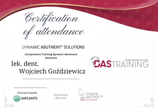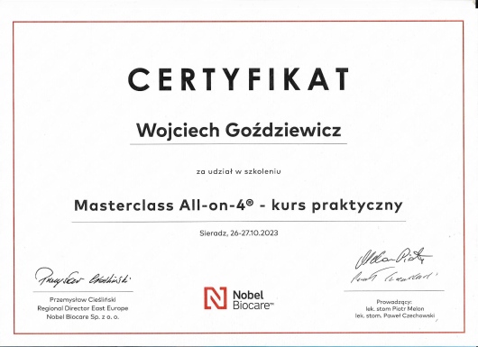 Moją pasją jest implantologia stomatologiczna, w której wprowadzam do praktyki klinicznej najnowsze światowe osiągnięcia uczestnicząc w licznych kursach i spotkaniach w Polsce i za granicą. Na implantach wykonuje uzupełnienia od pojedynczych braków zębowych, aż po całkowite bezzębie dzięki technice All-on-4 w której uzyskałem certfikat Masterclass by Nobel Biocare.