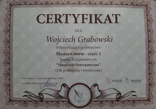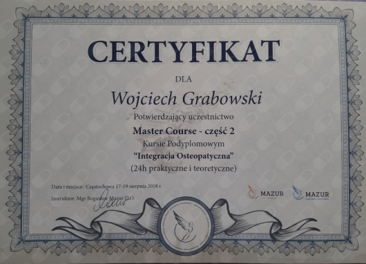 Pomagam w przywróceniu zdrowia, uwolnieniu Ciebie od obciążeń w ciele, od napięć i bólu. Jestem dyplomowanym osteopatą(D.O.), fizjoterapeutą z 20 letnim doświadczeniem. Zapraszam do prywatnego gabinetu. Ponadto jako asystent pomagam szkolić studentów w szkole osteopatii SAO (Still Academy of Osteopathy) Ukończyłem 5 letnie studia Medycyny Osteopatycznej FICO (Flanders International College of Osteopathy) oraz 5 letnie studia z fizjoterapii na Akademii Wychowania Fizycznego. Staram się dotrzeć do pierwotnej przyczyny dysfunkcji, wspierającym i optymalizującym procesy samoleczenia organizmu. Osteopatia to moja pasja. Stale doskonalę swoje umiejętności sztuki osteopatycznej na wielu szkoleniach dostępnych na rynku podyplomowej edukacji. Zapraszam