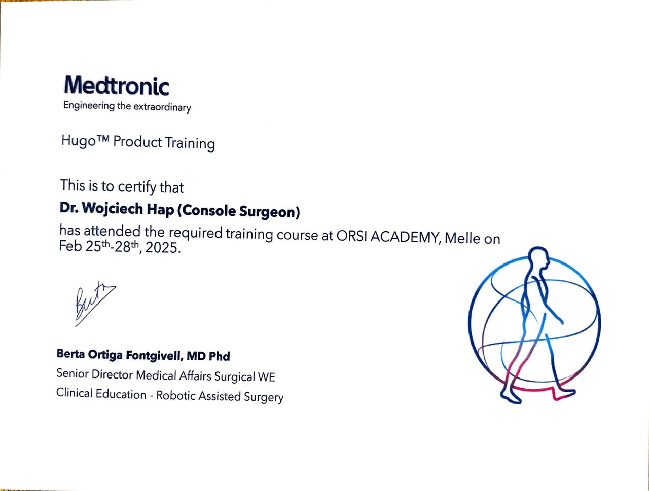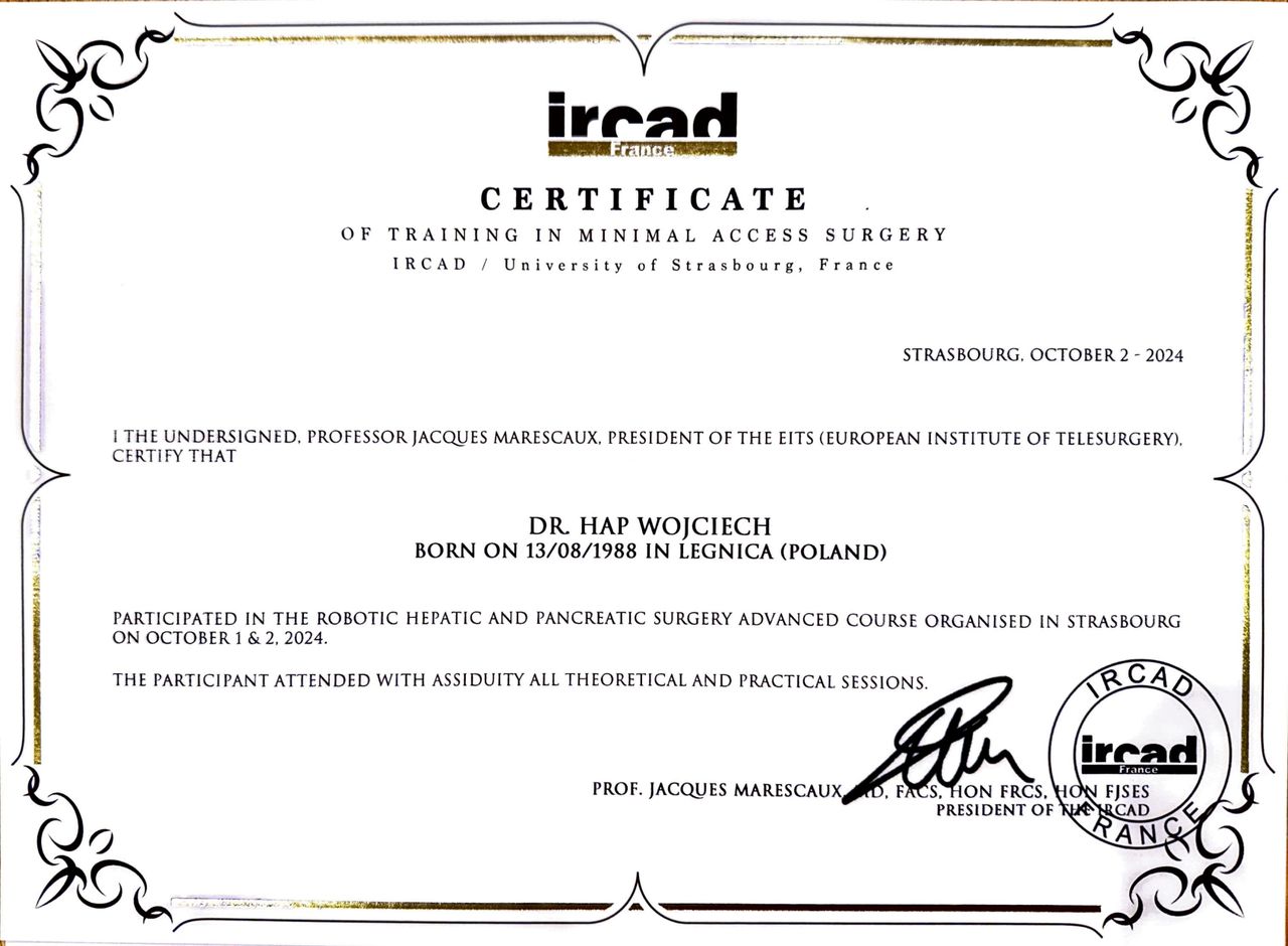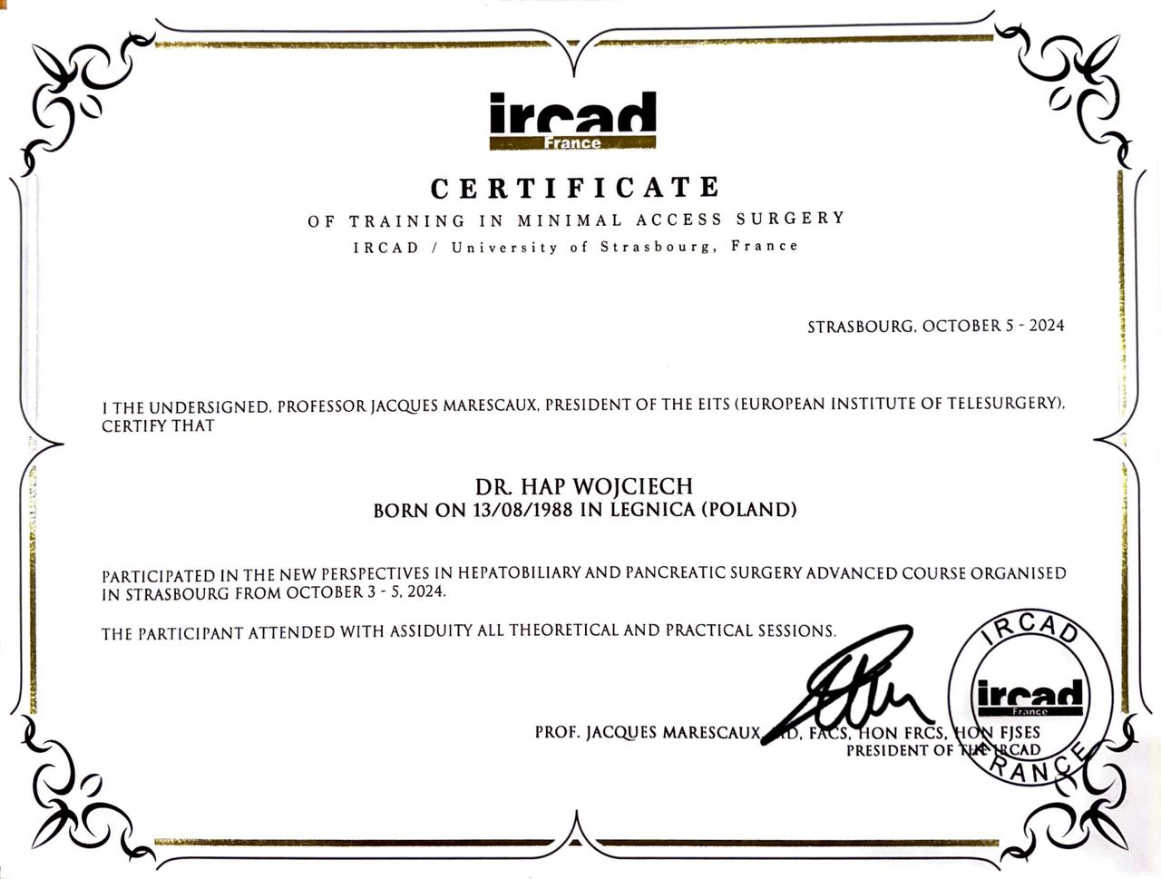 Ukończyłem Wydział Lekarski Uniwersytetu Medycznego we Wrocławiu w 2013 roku. Do kwietnia 2021 roku pracowałem na stanowisku asystenta w Klinice Chirurgii Ogólnej i Chirurgii Onkologicznej we Wrocławiu, gdzie w 2020 roku uzyskałem stopień doktora nauk medycznych. Od kwietnia 2021 roku pełnię funkcję Kierownika Oddziału Chirurgii Ogólnej Szpitala św. Łukasza w Bolesławcu. Swoje umiejętności rozwijałem uczestnicząc w stażach i kursach w Korei Południowej, Francji, Szwajcarii i Belgii. Pasjonuję się chirurgią małoinwazyjną. Jestem autorem wielu publikacji naukowych i wystąpień kongresowych, a także współautorem podręcznika dla chirurgów przygotowujących się do egzaminu specjalizacyjnego. Jestem aktywnym członkiem towarzystw naukowych: Towarzystwa Chirurgów Polskich, International Society for Fluorescence Guided Surgery (ISFGS) i Society of Robotic Surgery (SRS). Moje zainteresowania zawodowe to: chirurgia robotyczna i laparoskopowa przewodu pokarmowego, zwłaszcza nowotworów trzustki, dróg żółciowych, jelita grubego i żołądka, chirurgia laparoskopowa przepuklin pachwinowych, brzusznych i rozworu przełykowego, chirurgia laparoskopowa z wykorzystaniem barwników fluorescencyjnych (ICG), chirurgia tarczycy i nadnerczy. Jestem certyfikowanym chirurgiem systemu robotycznego Hugo RAS.