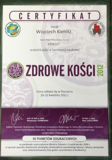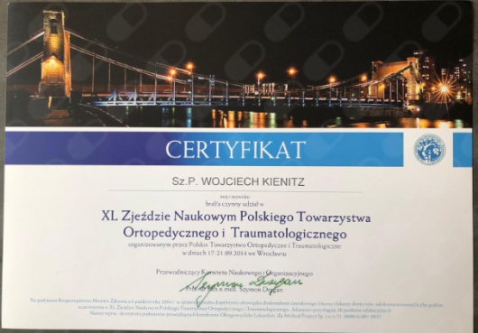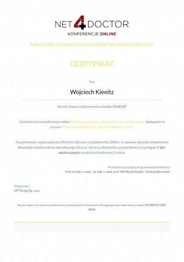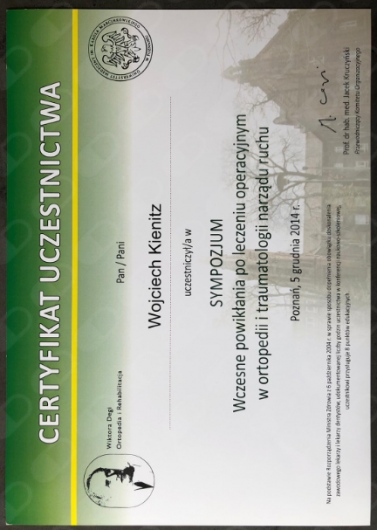 Dr Wojciech Kienitz jest lekarzem w trakcie specjalizacji, prowadzi konsultacje ortopedyczne w Gabinetach Lekarskich Grochowska 9 oraz operuje w naszym szpitalu Medicus-Bonus w Środzie Wielkopolskiej. Zakres konsultacji i operacji: wszelkie urazy sportowe zabiegi ortopedii sportowej endoprotezoplastyka stawów biodrowych, kolanowych leczenie złamań rekonstrukcje więzadeł krzyżowych artroskopie stawu skokowego, stawu kolanowego łokieć tenisisty leczenie zachowawcze: podawanie osocza bogatopłytkowego – na miejscu w gabinecie leczenie przewlekłych entezapatii (są to bolesne zmiany chorobowe stawów, wynikające z działania nadmiernych naprężeń i obciążeń) drobne zabiegi ortopedyczne w gabinecie (np. usuwanie szwów, wymiana gipsu, unieruchomienia) Dr Wojciech Kienitz interesuje się w szczególności chirurgią kolana i ortopedią sportową.