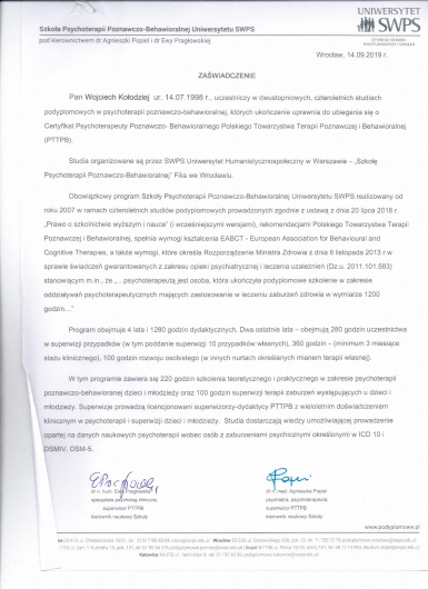 nazywam się Wojciech Kołodziej, jestem magistrem Psychologii i Socjologii oraz jestem certyfikowanym psychoterapeutą poznawczo-behawioralnym po 4-letniej szkole psychoterapii w modulacji poznawczo-behawioralnej (CBT). W pracy terapeutycznej stosuję elementy Terapii Schematu oraz Terapii Dialektyczno-Behawioralnej (DBT).
