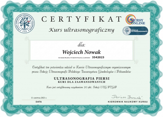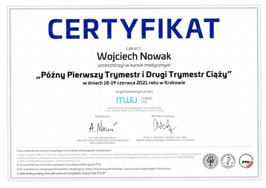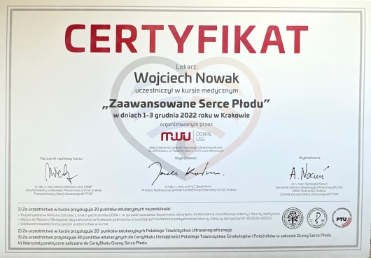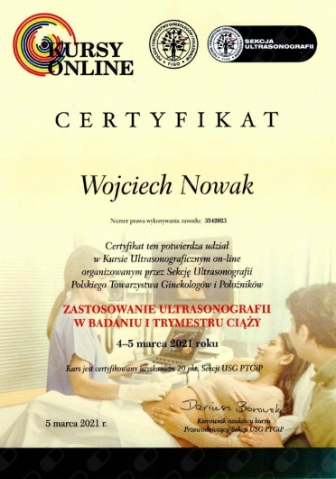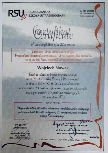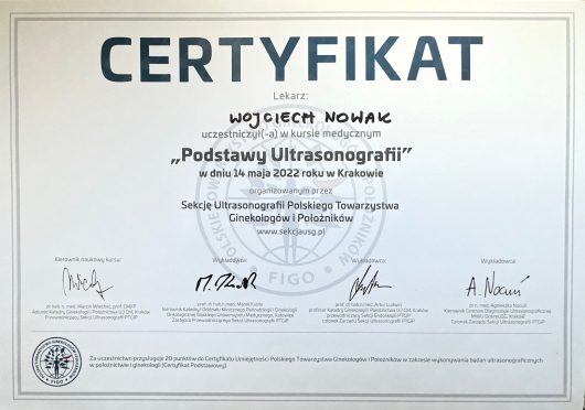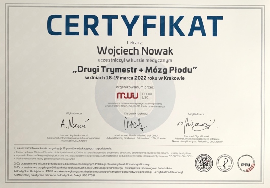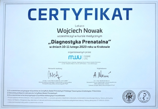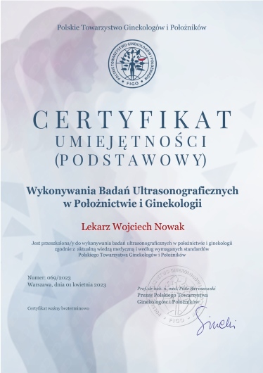 Legitymuję się certyfikatem Fetal Medicine Foundation (FMF ID: 244864) oraz certyfikatem umięjętności wykonywania badań prenatalnych PTGiP (Numer: 119/2024), upoważniającymi do przeprowadzania badań prenatalnych.