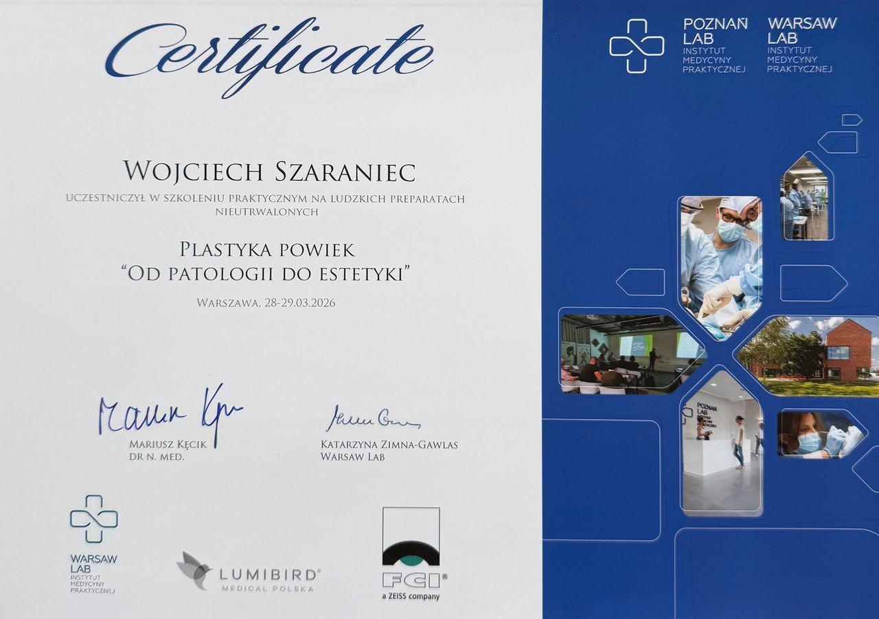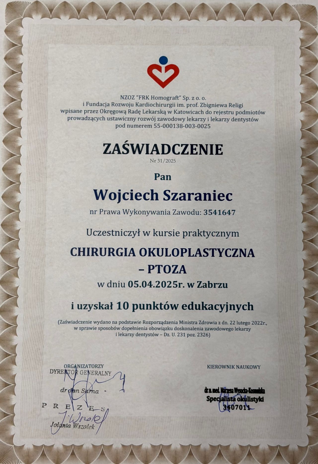 Nazywam się Wojciech Szaraniec. Jestem specjalistą okulistyki. Szkolenie specjalizacyjne odbywałem w Uniwersyteckim Centrum Klinicznym im. prof. Gibińskiego w Katowicach przy ul. Ceglanej, w którym nadal jestem starszym asystentem.