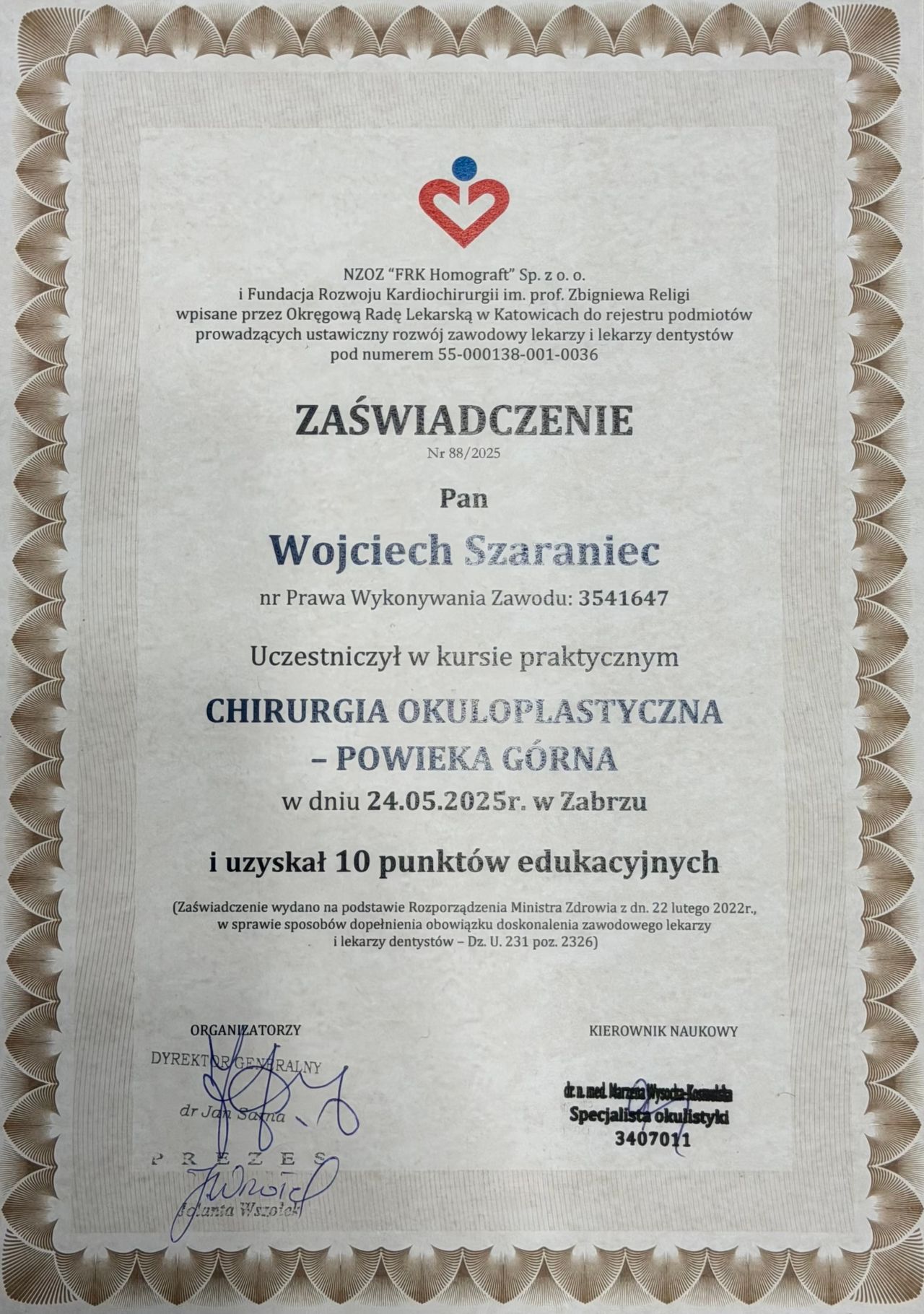 Jaki jest zakres porad oferowanych przez Wojciech Szaraniec?Wojciech Szaraniec to okulista. Na podstawie swojego doświadczenia i wykształcenia Wojciech Szaraniec oferuje usługi takie jak: konsultacja okulistyczna, blefaroplastyka, Plastyka powiek górnych z usunięciem przepuklin tłuszczowych, usunięcie kępek żółtych, usunięcie gradówki, Płukanie kanalików łzowych, Osocze bogatopłytkowe, Konsultacja przedzabiegowa, plastyka powiek, plastyka powiek górnych.