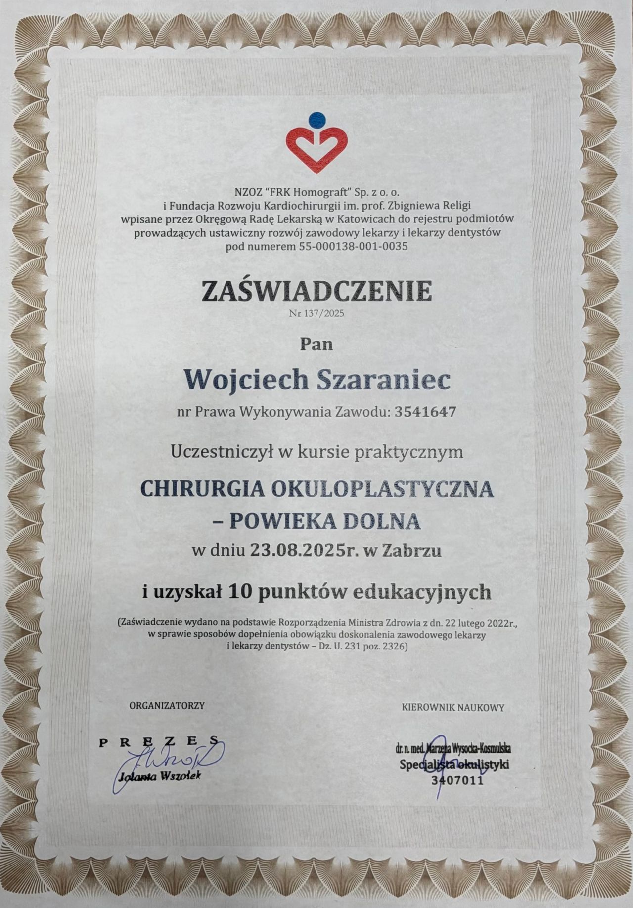 Wspaniały specjalista! Miałam u Pana Doktora usuwany jęczmień z powieki i jestem pod ogromnym wrażeniem podejścia do pacjenta. Czułam się niesamowicie zaopiekowana. Pan Doktor Wojciech Szaraniec jest nie tylko świetnym fachowcem, ale też bardzo opiekuńczym i ciepłym człowiekiem, co przy stresujących zabiegach na oku jest nieocenione. Zdecydowanie polecam każdemu, kto szuka okulisty z powołania.