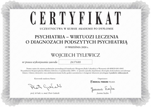 Jaki jest zakres porad oferowanych przez Wojciech Tylewicz?Wojciech Tylewicz to psychiatra. Na podstawie swojego doświadczenia i wykształcenia Wojciech Tylewicz oferuje usługi takie jak: konsultacja psychiatryczna (pierwsza wizyta), konsultacja psychiatryczna (kolejna wizyta), konsultacja online, konsultacja online (kontrolna).