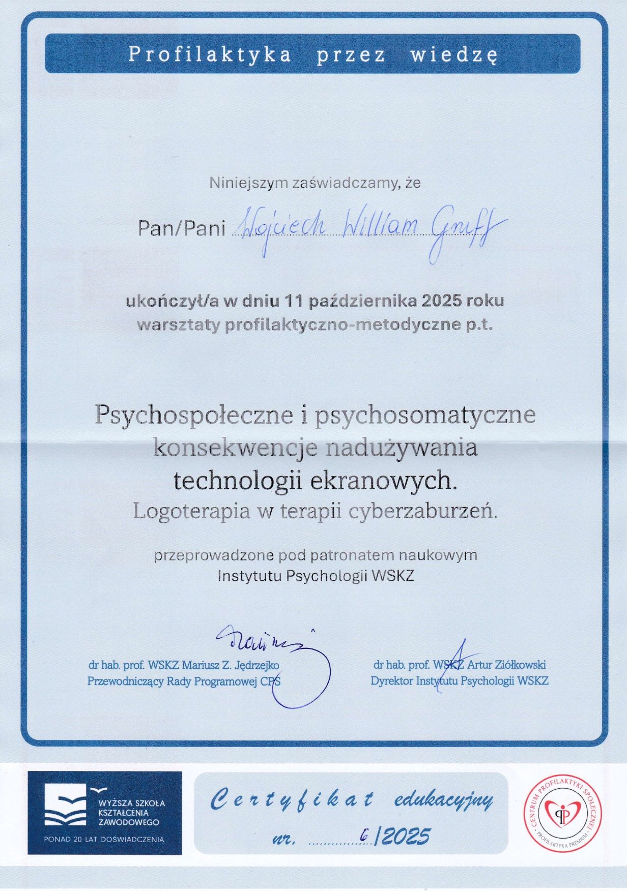 "Psychospołeczne i psychosomatyczne konsekwencje nadużywania technologii ekranowych. Logoterapia w terapii cyberzaburzeń", Instytut Psychologii WSKZ 2025