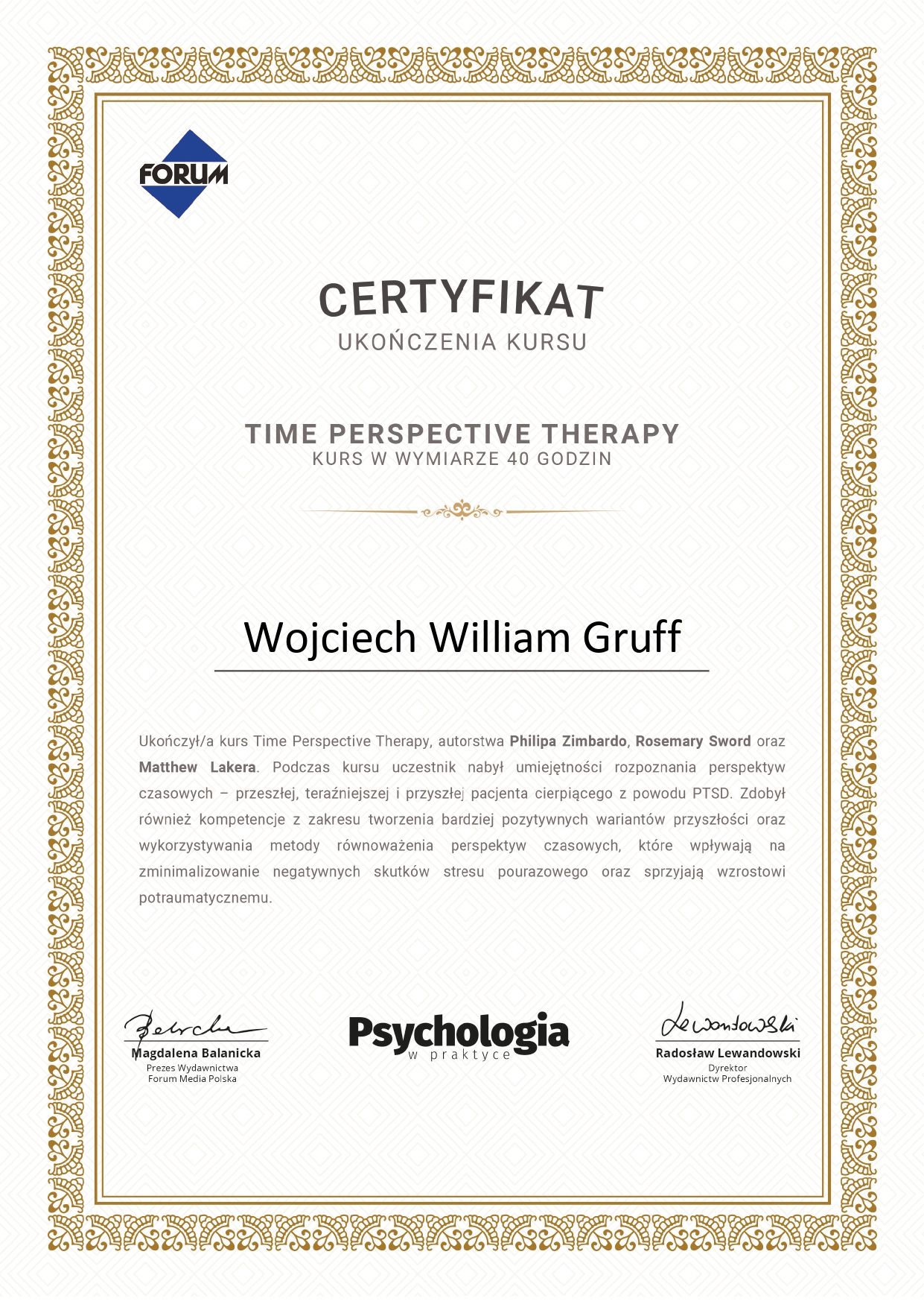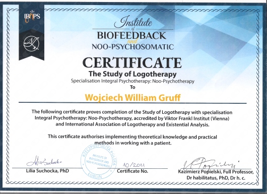 Logoterapia (psychoterapia skoncentrowana na sensie i wartościach) z akredytacją Viktor Frankl Institut w Wiedniu i International Association of Logotherapy and Existential Analysis o specjalizacji: Psychoterapii Integralnej: Noo-Psychoterapii,