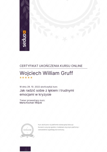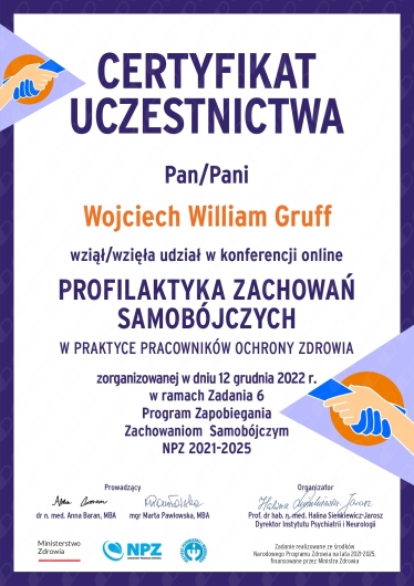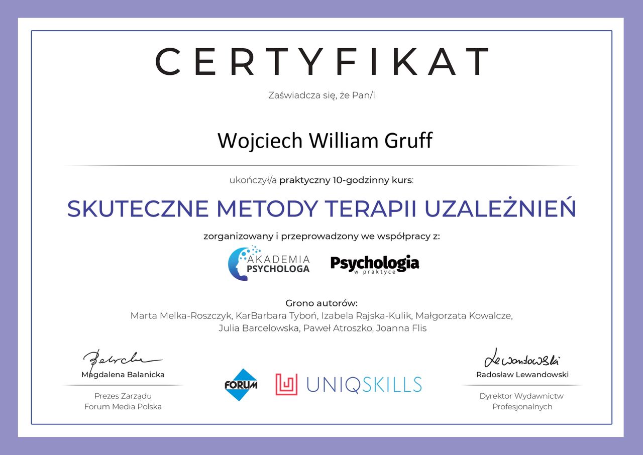 W toku trudności z jakimi zmierzyłem się w swoim życiu poznałem swój sens, czyli inspirowanie i pomaganie w odnajdywaniu sensu w trudnościach. Dzięki mojemu doświadczeniu patrzę na trudności człowieka z różnych perspektyw. W swojej pracy korzystam z metod logoterapeutycznych, behawioralno-poznawczych, arteterepeutycznych, a nawet aktorskich. Jestem autorem książki "Niemożliwe załatwiam od ręki, czyli Podręczny Poradnik Rozwiązywania Problemów." Jestem Członkiem Polskiego Towarzystwa Logoterapii i Noo-Psychosomatyki. Swoją pracę poddaję superwizji.