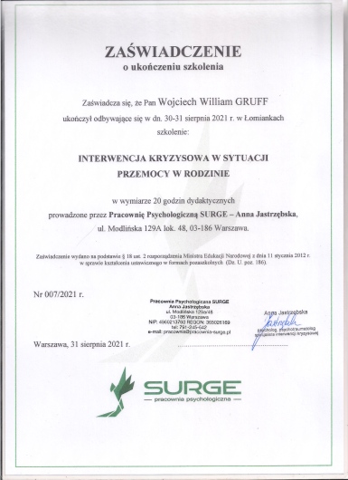 Interwencja Kryzysowa w Sytuacji Przemocy w Rodzinie, Pracownia Psychologiczna SURGE 2021,