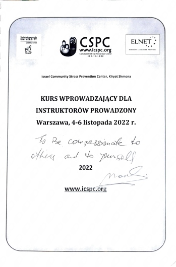 Kurs wprowadzający dla instruktorów interwencji kryzysowej, Israel Community Stress Prevention Center, Kiryat Shmona, Warszawa 2022,