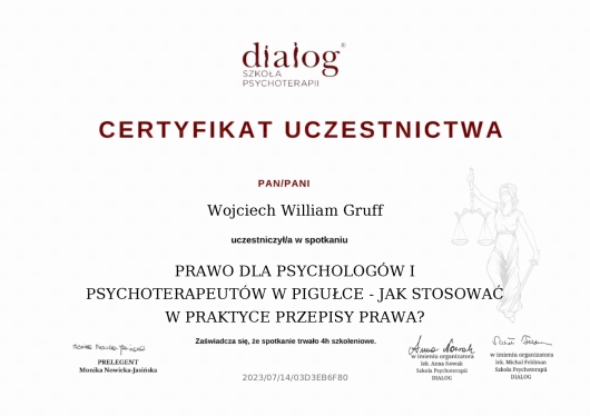 "Prawo dla psychologów i psychoterapeutów w pigułce - jak stosować w praktyce przepisy prawa?", Szkoła Psychoterapii Dialog 2023,