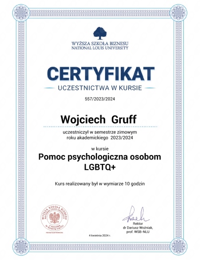 Pomoc psychologiczna osobom LGBTQ+, Wyższa Szkoła Biznesu – National Louis University (Chicago) z siedzibą w Nowym Sączu 2024,