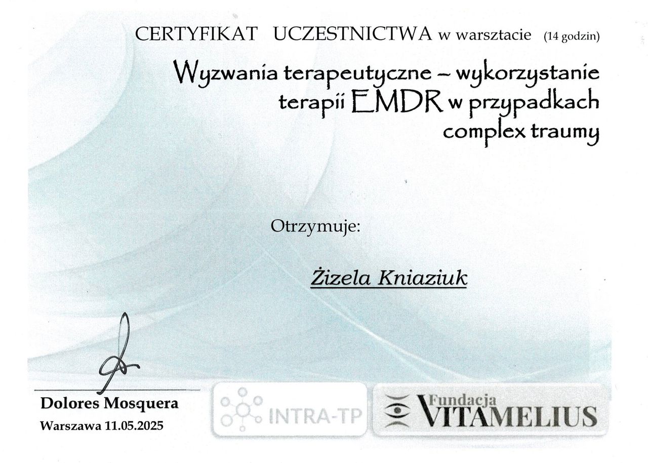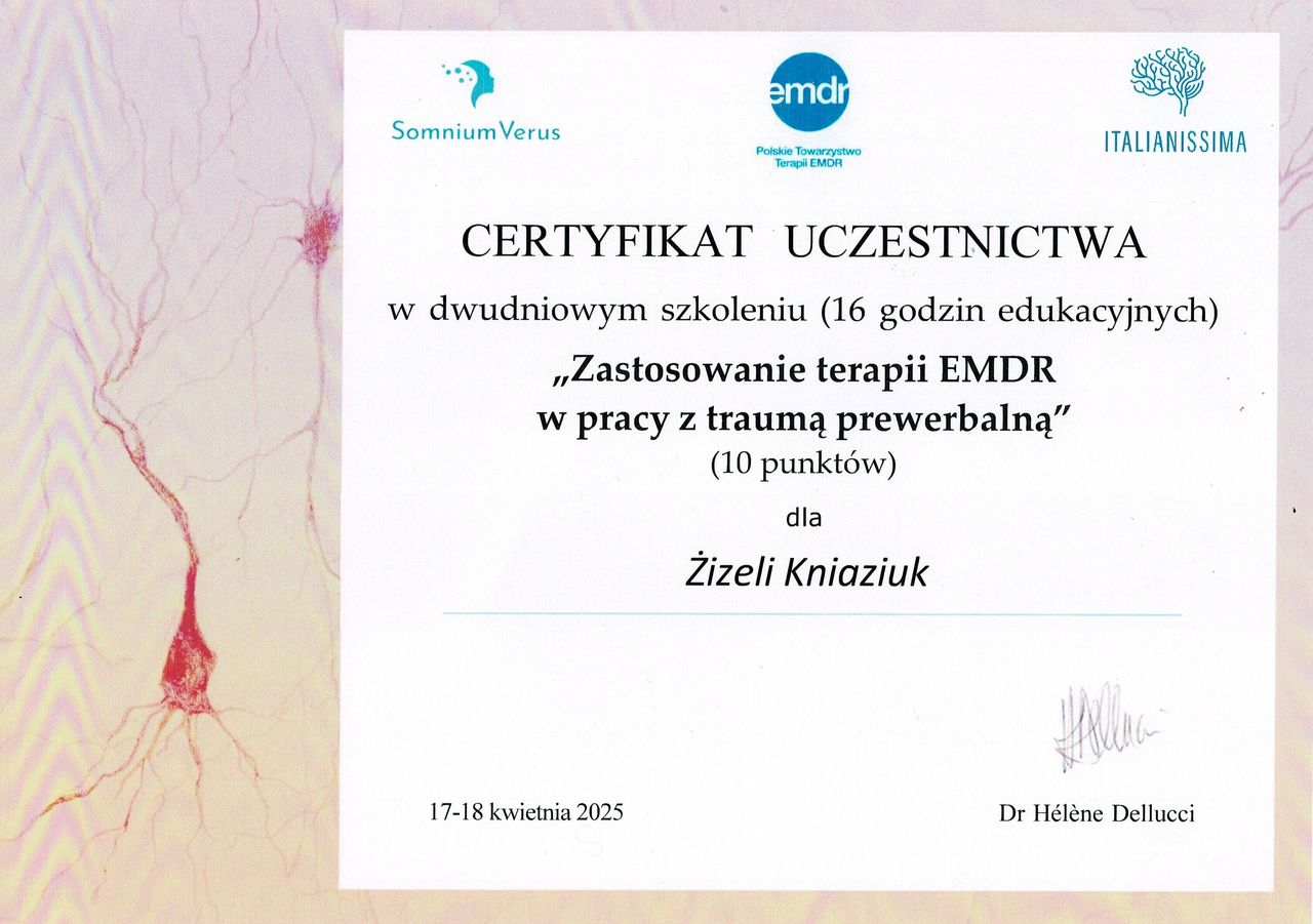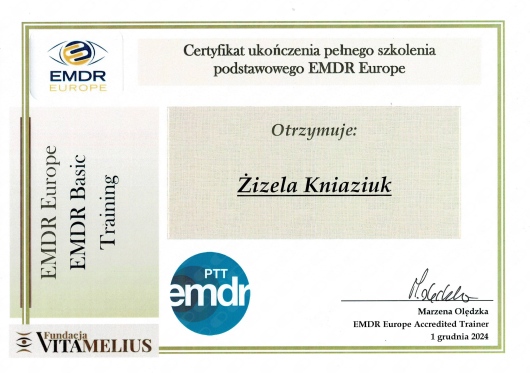 Ukończyłam certyfikowane szkolenia z terapii EMDR.